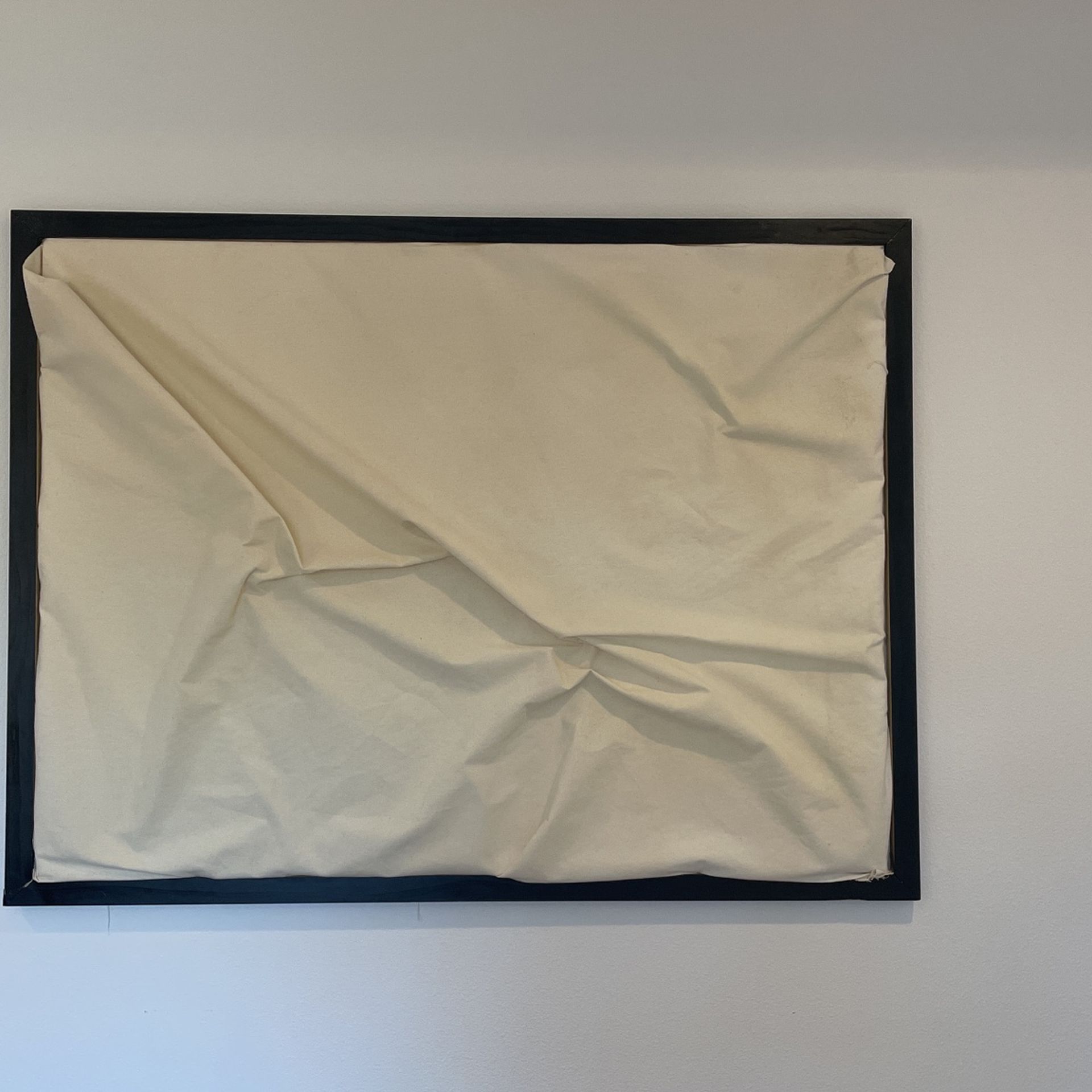 This is original artwork from a local Portland Artist. It features a heavy beige canvas design stretched loosely across a wooden frame. The piece is large, a great statement piece for a large room. Because of its comforting, sensual appeal it may do well in a bedroom or cozy living room.