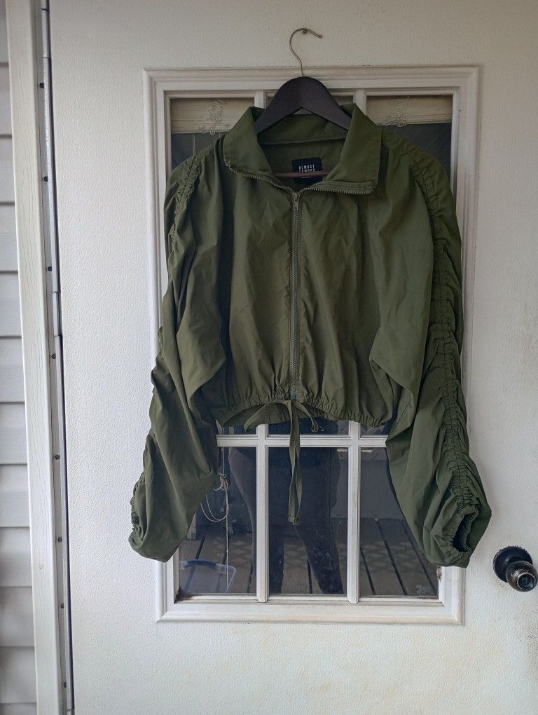 Almost famous green jacket light weight Sz L. In fair condition no rips just has stains as you can see in the pictures, zipper works perfectly. See all pictures for more details and measurements.