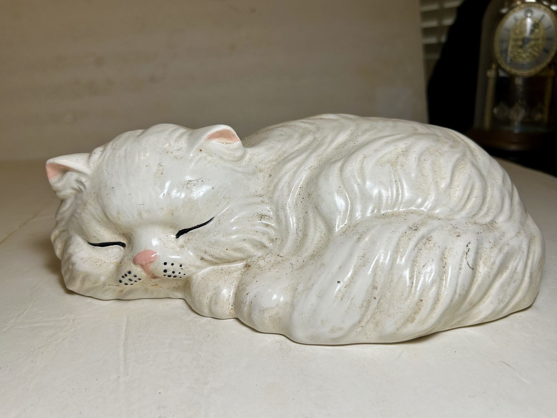 Beautiful Vintage 1970 Ceramic Long Haired Sleeping White Cat Hand Painted Nice!