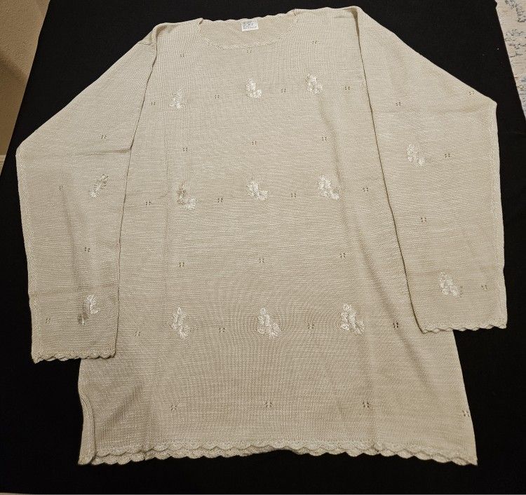 It features a white floral embroidery and a scalloped hem. The garment appears to be a vintage or cottagecore style, often referred to as an embroidered tunic or sweater depending on its precise weight and length.