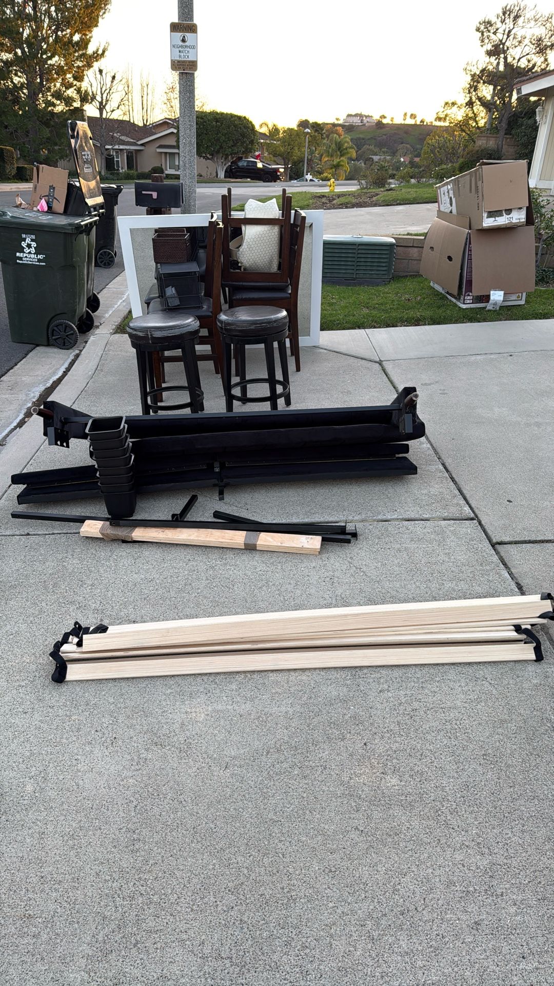 First come first serve. Take it all or whatever you’d like. There’s barstools mirrors and a queen bed frame. All items are out on the driveway for anyone to take. I will be putting more items out in the front throughout the weekend. Message me for my address.