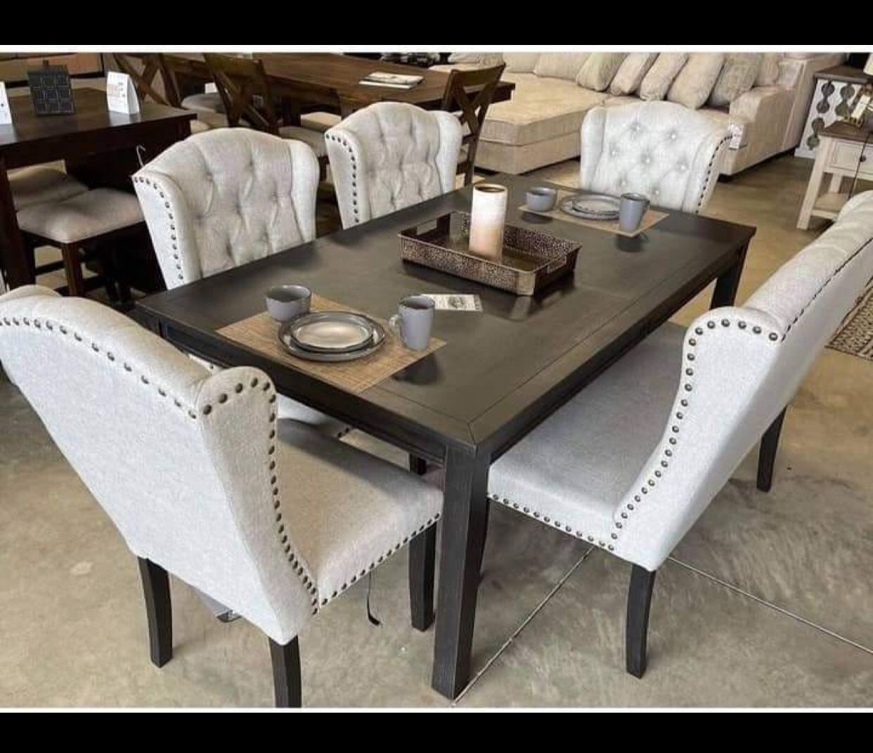Black Dining Rectangular Table And Tufted Upholstered Linen Chairs☑️7 Piece Dining Set🌟 New Brand 💯