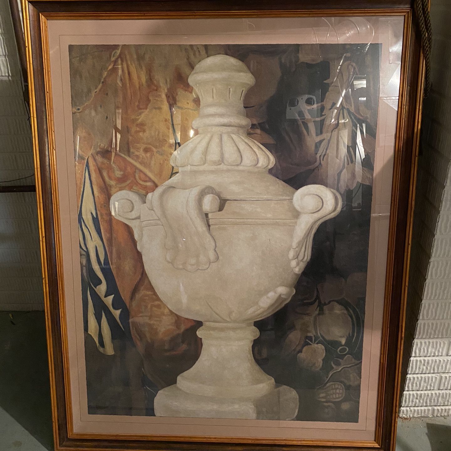 2 large paintings with brown wooden frames. Tassels included for hanging and decoration. Measures 56in tall x 44in wide end to end with frame. The 2 paintings are of similar limestone figures. Sold as a set but would consider selling individually. $180 for set