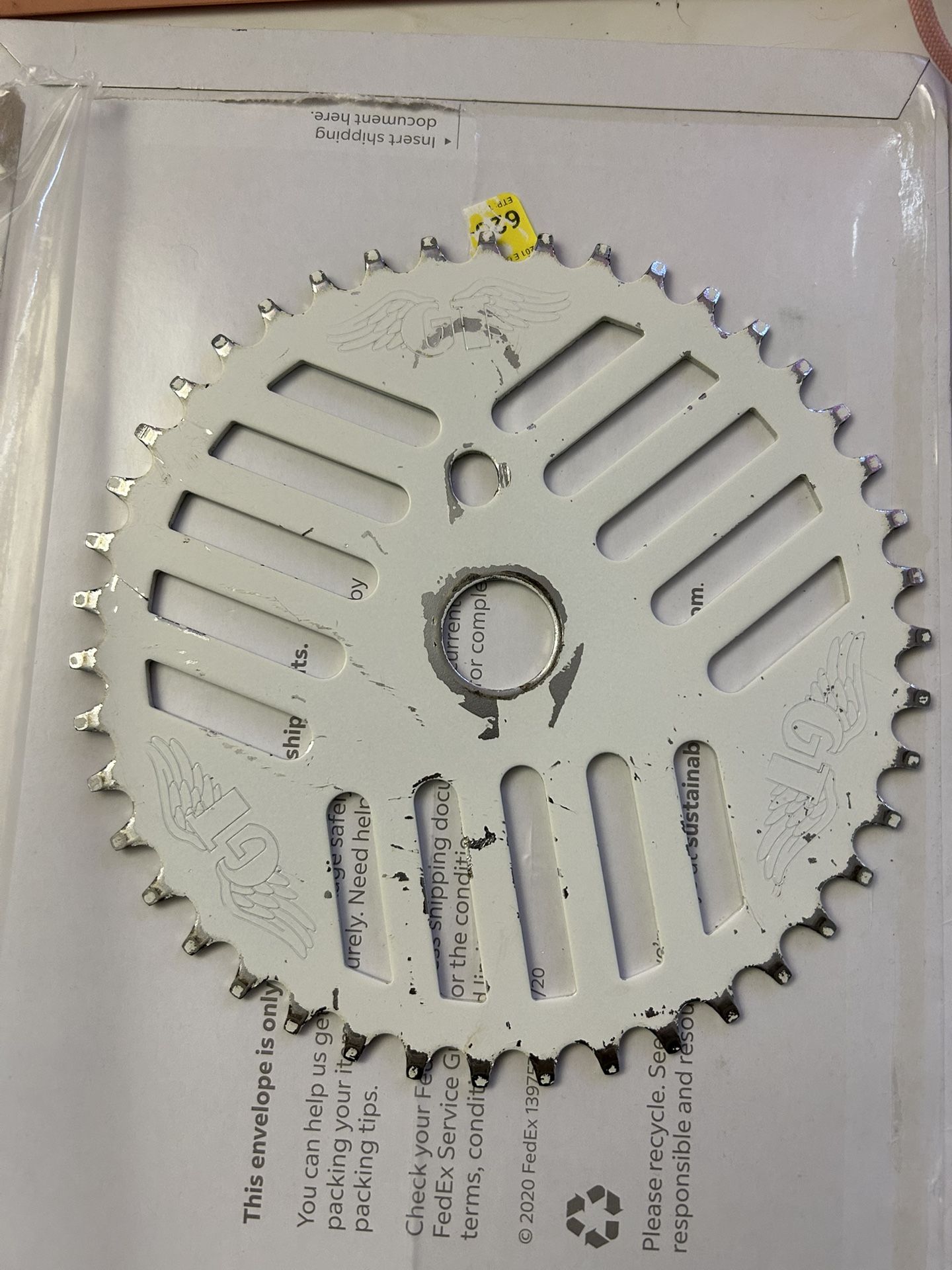 Original white finish GT cheese grater in survivor condition. Very well kept, just the usual wear and tare. Sits perfectly flat, just cosmetic wear. This sprocket came in all DYNOS detour and GT PERFORMER in 1986 and 1987. PRICE IS FIRM!!