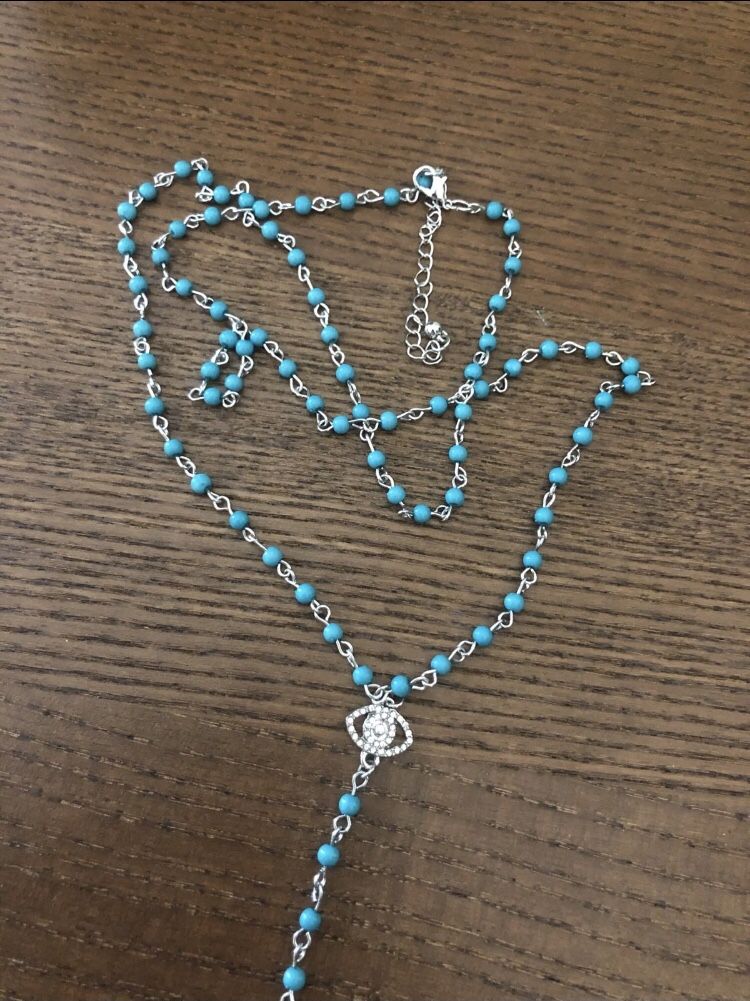 Gorgeous rosary style crystal and beads necklace Blue beads, crystal evil eye charm and a quartz pendant Silver plated 26 inches with 3 inch extender till the charm and another 7 inches till pendant Brand new Message if you would like to purchase multiple items from my store