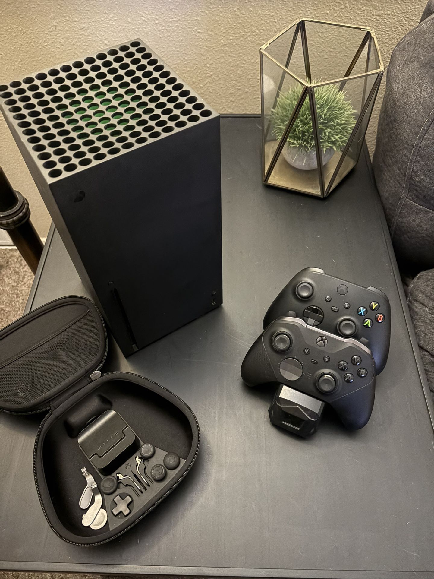 • 2 wireless controllers (one standard, one Elite-style) • Console in good cosmetic condition • Extra thumbsticks/paddles kit in the case All cables included and charging station. Only selling because I have a PC which contains Xbox games no longer need the console. Only used for approximately 40+ hours.