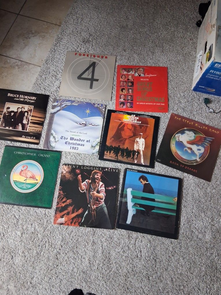 *Fleetwood Mac- Mirage $20 *Stevie Nicks- The wild heart $30 * Linda Ronstadt- Greatest hits$40 *Tears for fears-songs from the big chair$40 *Bobby Mcferrin- spontaneous inventions$20 *Johnny River- A touch of gold$20 *Barry Manilow-This ones for you$20 * Joe Cockers- Greatest hits$50 *Fleetwood Mac- 1975 album $50 *Barry Manilow- trying to get the feeling$30 *Barry Manilow- ll $30 *Cyndi Lauper- she's so unusual$40 *Fleetwood Mac-Tango in the night$30 *Bruce Springsteen-tunnel of love$30 *Paul Simon-Graceland$50 *chilling trilling sounds of the haunted house 1964 Disney$50 *Steve Winwood- talking back to the night$30 *Henry Gross- Release $25 *An officer and a gentleman-1982 island records original soundtrack $27 *The Stevie Miller band- book of dreams $20 *Bob Scaggs- silk degrees $20 *Bing Crosby- Merry Christmas 1950s Decca$60 *Flashdance- Original soundtrack $25 *Bruce Hombsy& The Range-the way it is $40 *Kenny Loggins- alive $20 *foreigner- 4 $30 *Christopher Cross- flamingo $30 *the sword of the lord- the wonder of christmas 1983 $15 *Henry Mancini- Great songs of christmas by great artists $25 *Joyous Noel- collectors edition $35 *James Taylor-mud slide slim and the blue horizon $25 * the allen parsons project- the turn of a friendly card $50 *men at work- business as usual $30 *the power station- 33 1/2 $15 * Samantha song- emotion $28