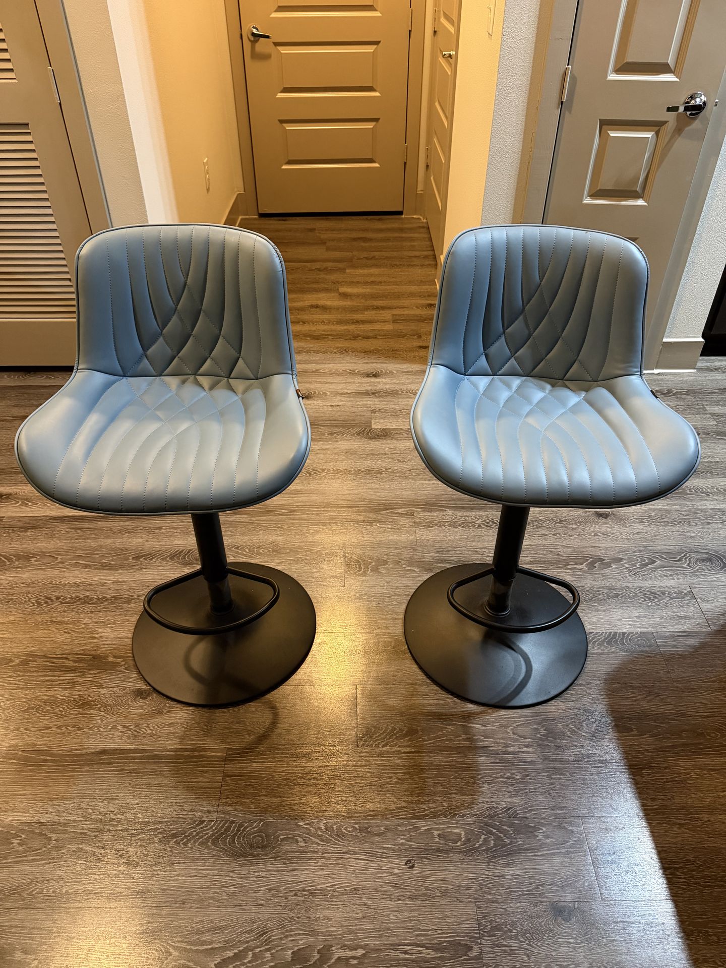 2 bar stools for sale. A set of blue faux leather bar stool with adjustable height and back. Dimensions: Height 31.88 in - 41.73in Seat Width: 19.29in Seat Depth: 16.92in