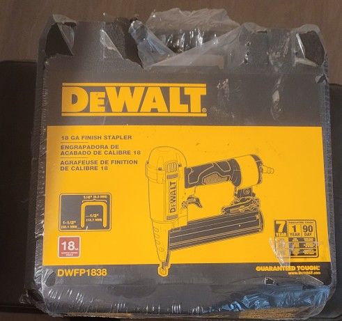 BRAND NEW IN THE BOX, NEVER OPENED The DEWALT DWFP1838 18-Gauge narrow crown stapler is ideal for most finish or trim nailing applications. The DWFP1838 is backed by a DEWALT 7-year limited warranty for added peace of mind. This kit includes stapler, fasteners, case, 1/4 in. fitting, belt hook and no-mar tips. Designed to drive 18-Gauge narrow crown staples 1/2 in. minimum L 1-1/2 in. maximum L 1/4 in. crown