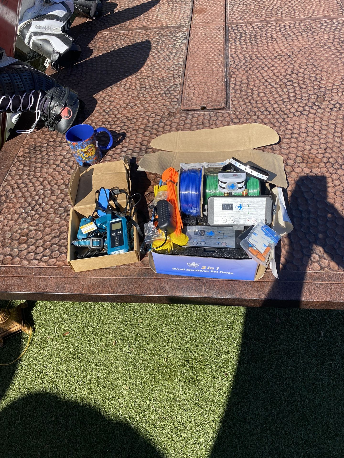 Box of electric fencing and other dog related items