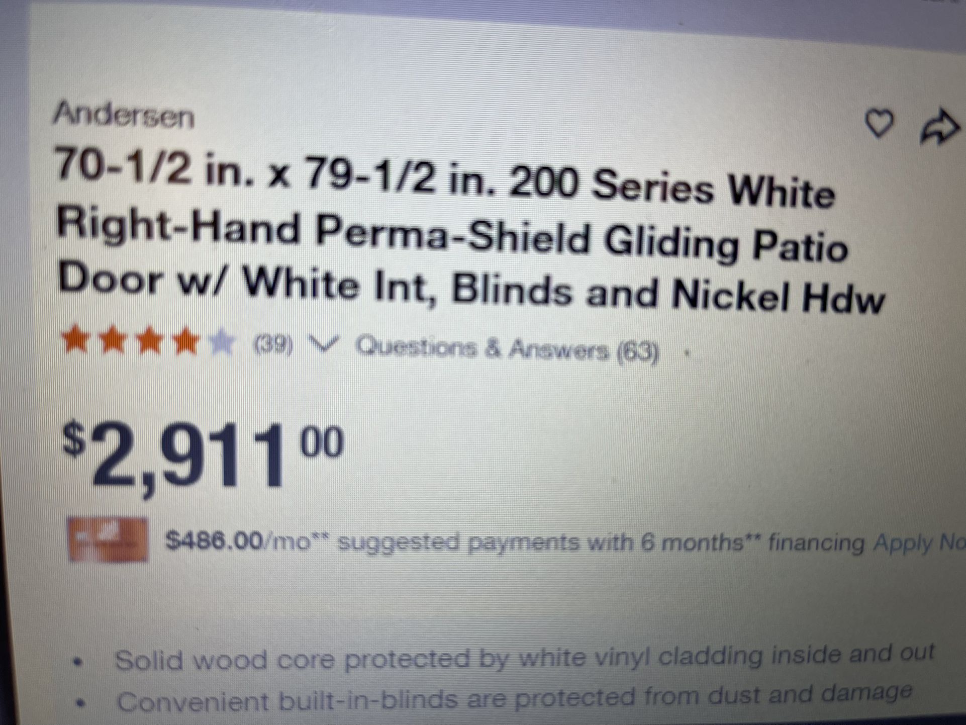 Anderson glass sliding door 72” W x 82 1/2” T. with built in blinds