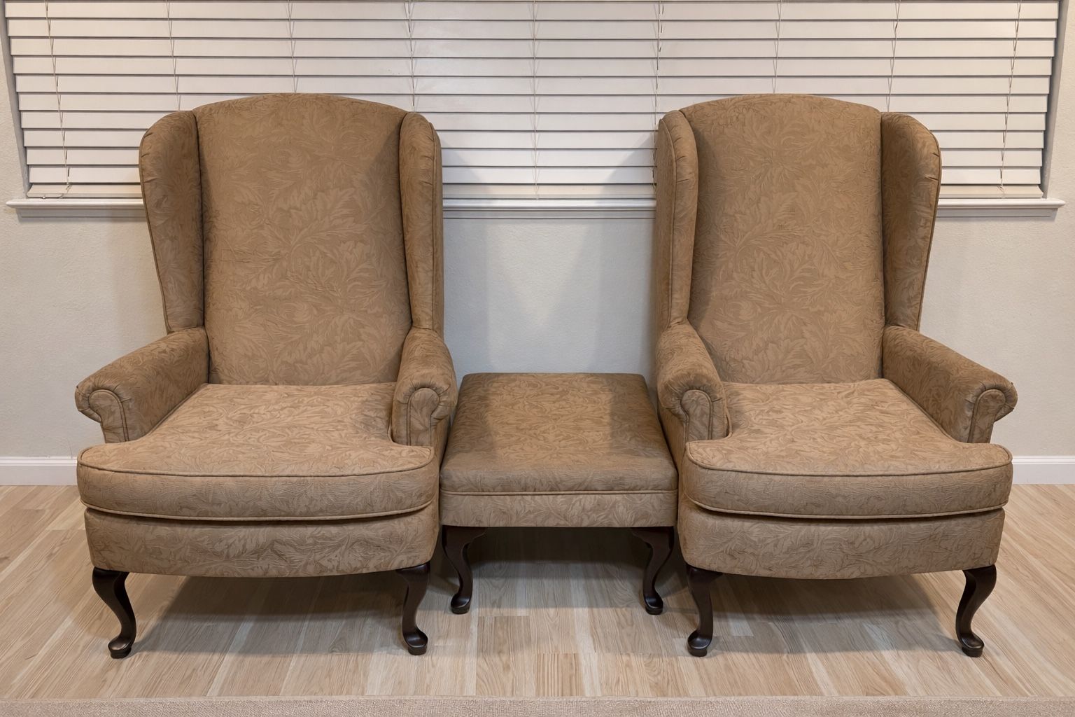 Selling a matching set of two wingback accent chairs with a coordinating ottoman. Upholstered in a neutral beige/tan patterned fabric with a classic leaf design. High backs, rolled arms, and dark solid wood cabriole legs give these chairs a timeless, traditional look. Set includes: • 2 wingback chairs • 1 matching ottoman Condition: Good used condition. Some visible wear on armrests from normal use (see photos), priced accordingly. List price is for the set, as I prefer to sell as a set. Pickup only. Cash or Zelle Comfortable, sturdy, and well-built—great for a living room, office, reading area, or bedroom. Ottoman can be used as a footrest or extra seating