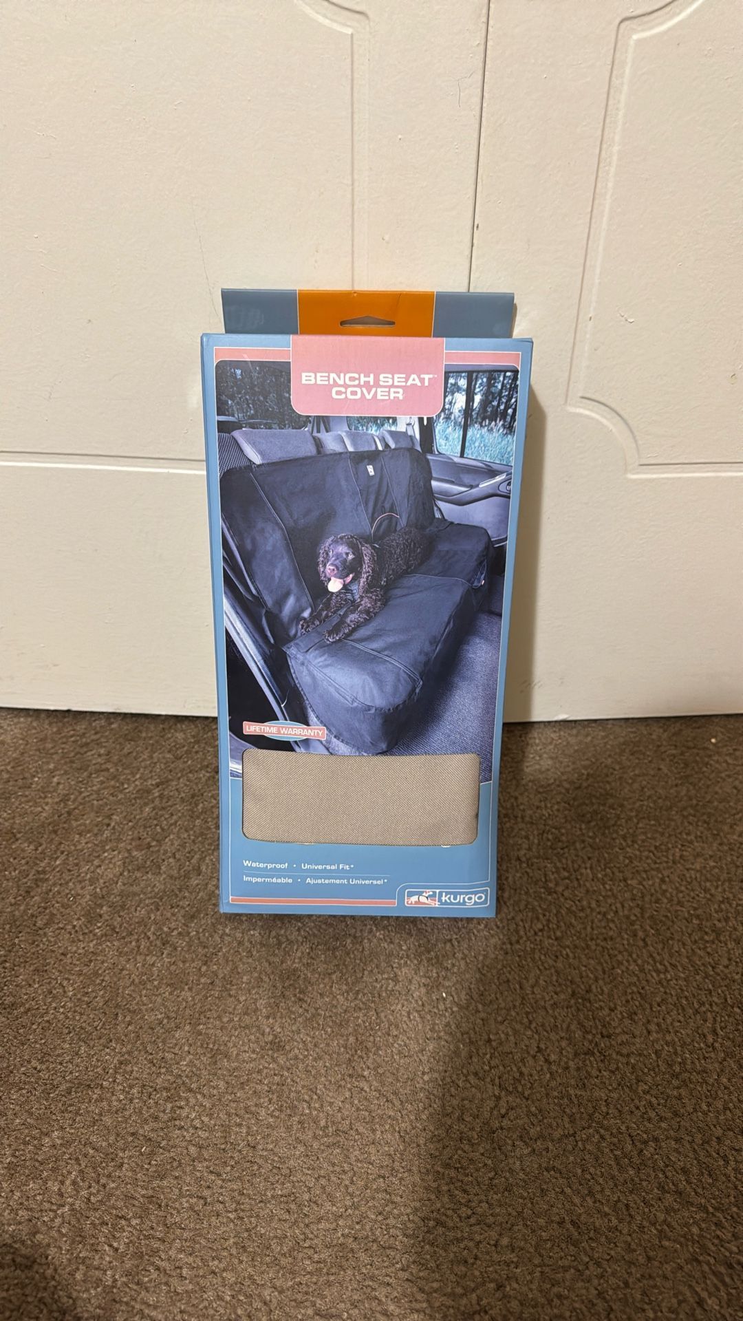 $50 OBO Bench Seat Cover By Kurgo. Tan color known as Hampton Sand, universal fit and waterproof. 2 Storage pockets with seatbelt slots. 55” wide, May not provide side to side coverage on extra large vehicles.
