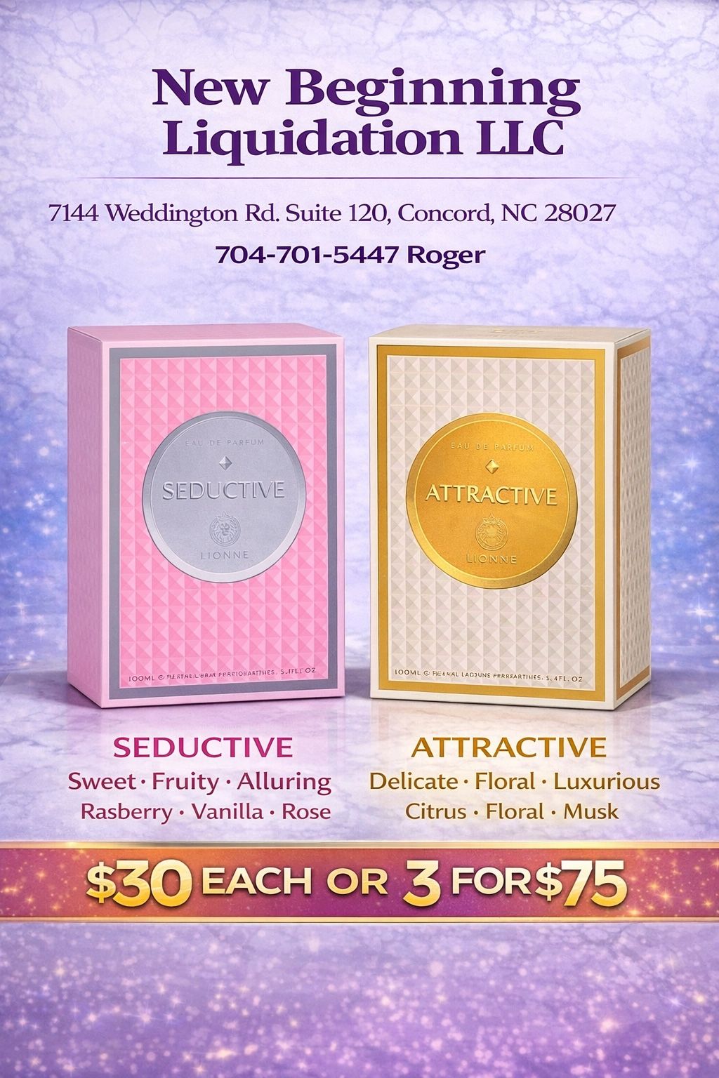 🌸 LIONNE SEDUCTIVE & LIONNE ATTRACTIVE – SMELL AMAZING FOR LESS 🌸 Two beautiful Lattafa Lionne fragrances that deliver elegance, sweetness, and luxury without the retail price. ✨ $30 EACH OR 3 FOR $75 ✨ LIONNE SEDUCTIVE Fragrance Type: Floral–Fruity Top Notes: Bergamot, Red Fruits Middle Notes: Jasmine, Rose, Lily of the Valley Base Notes: Musk, Sandalwood, Vanilla LIONNE ATTRACTIVE Fragrance Type: Floral–Fruity Top Notes: Citrus, Fruity Notes (Bergamot, Red Fruits) Middle Notes: Jasmine, Rose Base Notes: Musk, Sandalwood, Vanilla, Patchouli ✔️ Authentic Lattafa / Lionne fragrances ✔️ Brand new & sealed ✔️ Long-lasting with great projection 📍 New Beginning Liquidation 7144 Weddington Rd. Suite 120 Concord, NC 28027 📞 Roger: (contact info removed) 💳 Leasing Available with Acima & Snap 🚚 Delivery available starting at $75 Smell sweet. Smell classy. Smell unforgettable. Come grab yours today 🙌 #NewBeginningLiquidation #Lattafa #Lionne #FragranceDeals #SmellGoodDeals #ConcordNC #BigDealsBetterBeginnings