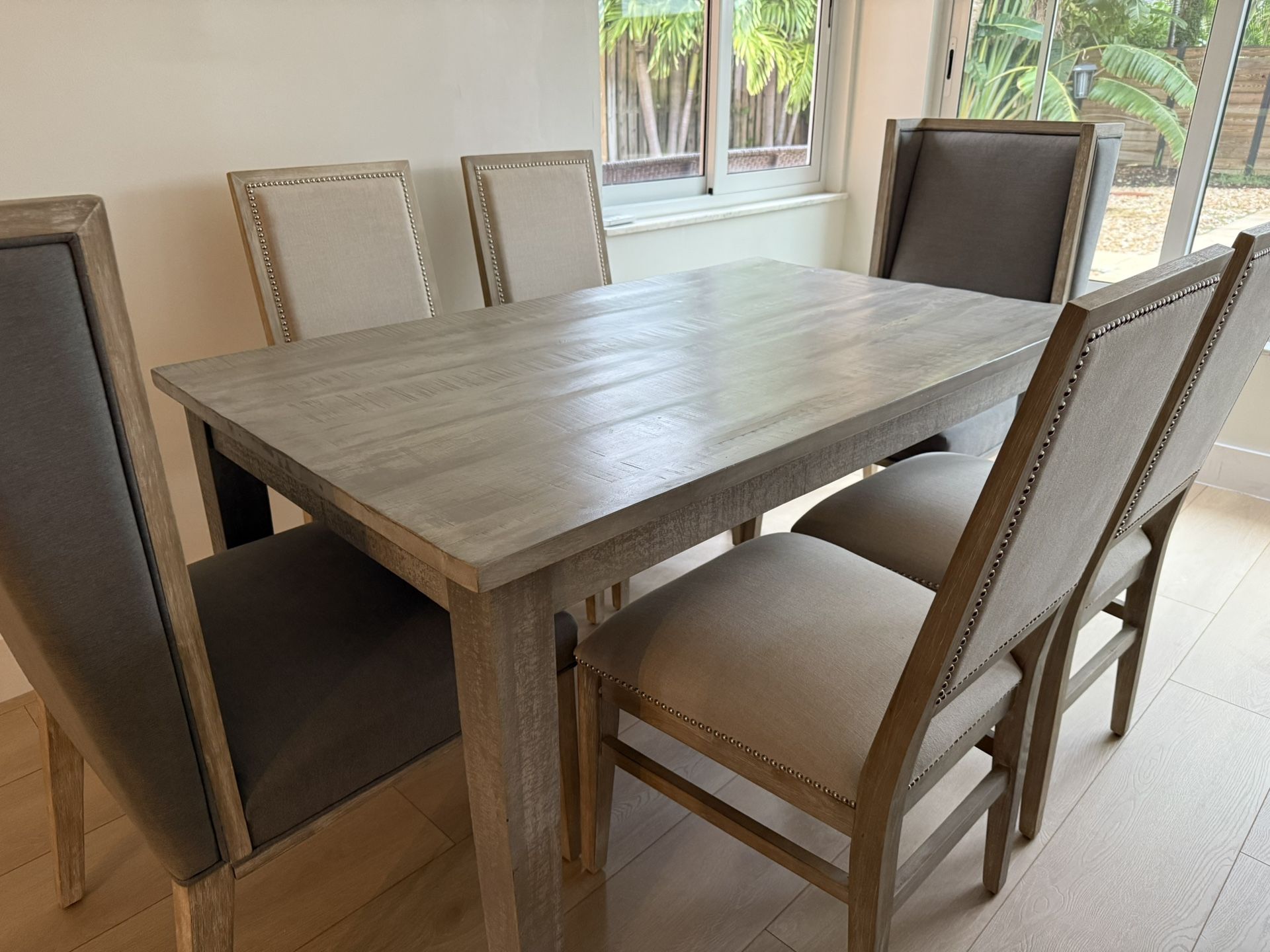 Originally purchased for >$2900 from Outside The Box in Palm Beach, pickup only E Pompano Beach. 60 inch real mango wood table. 2 statement wingback chairs and cream linen chairs with stud detailing. The linen chairs were purchased for $1380 (see receipt) as a set of 6, 2 spare chairs included unboxed Only used for occasional dinner parties, in great condition
