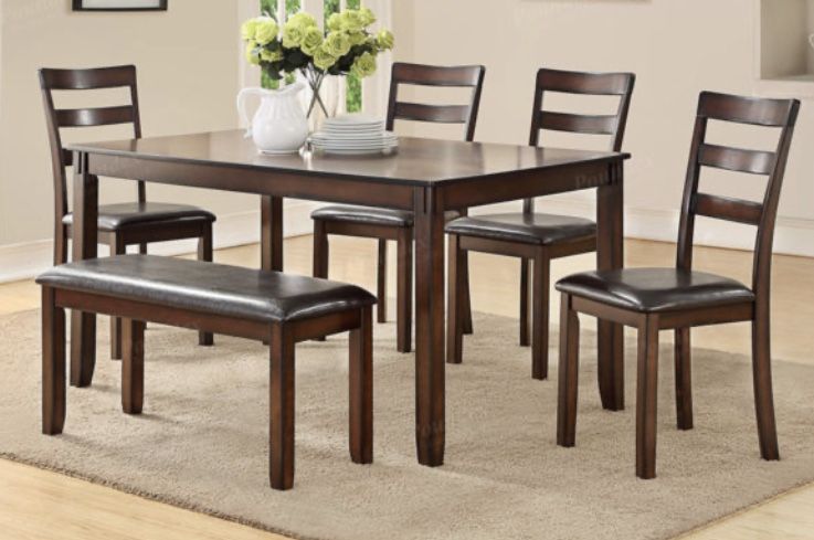 Classic style at its best is defined with this 6-piece casual dining set that includes a simple design of wood finished table, four chairs and a bench perfect for a versatile kitchen space. Dining Table + 4 Chairs & Bench Item # F2547 Materials: MDF w/ Birch Veneer Rubber Wood Cushion Dimensions: Table: 60″ x 36″ x 30″H Chair: 17″ x 21″ x 38″H Bench: 38″ x 15″ x 19″H Some Assembly Required