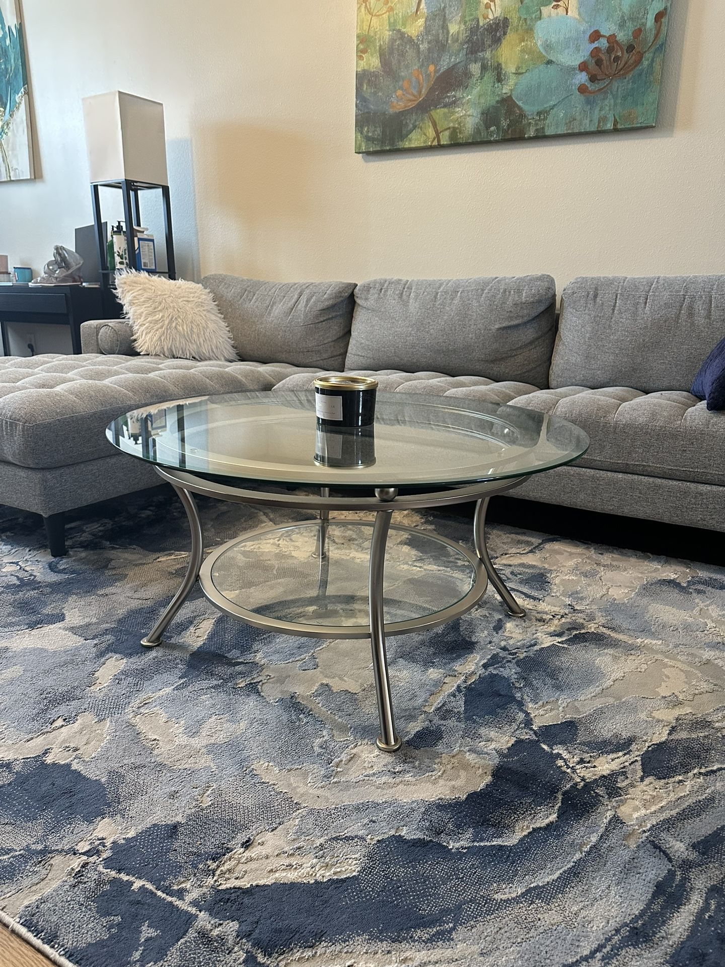 Glass living room table in good condition. 38 inches wide, 19 inches tall.