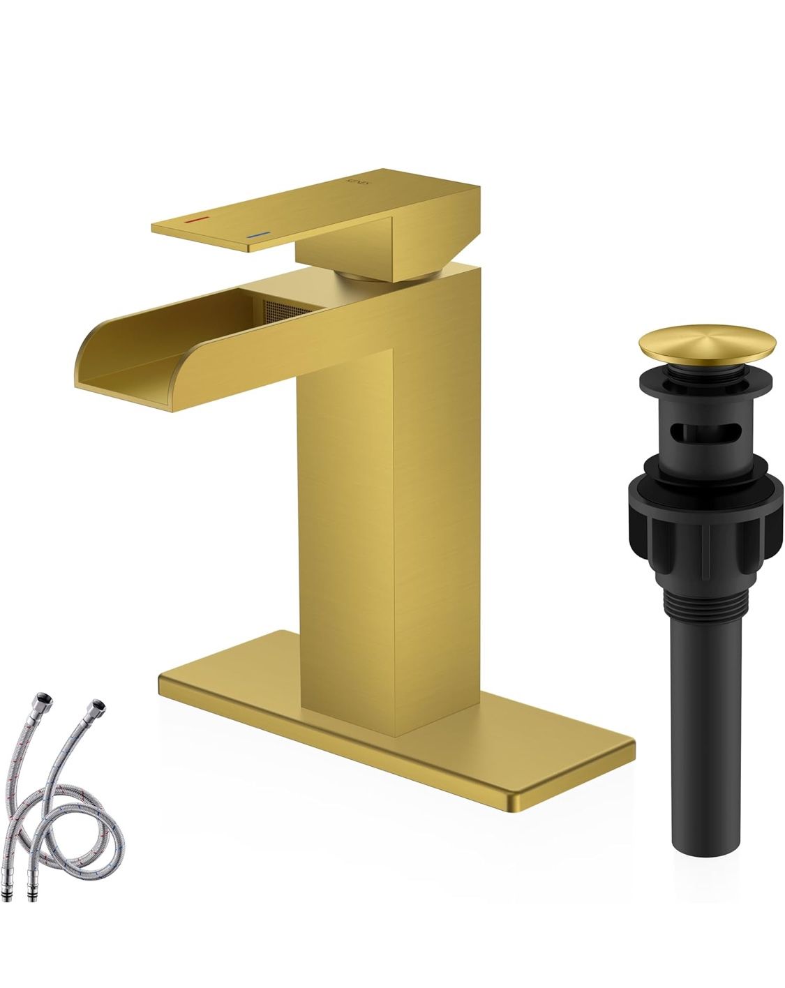 KENES Brushed Gold Waterfall Bathroom Faucet, Modern Single Hole Faucet, Single Handle Gold Faucet, with Pop Up Drain and Water Supply Hoses LJ-9035-4