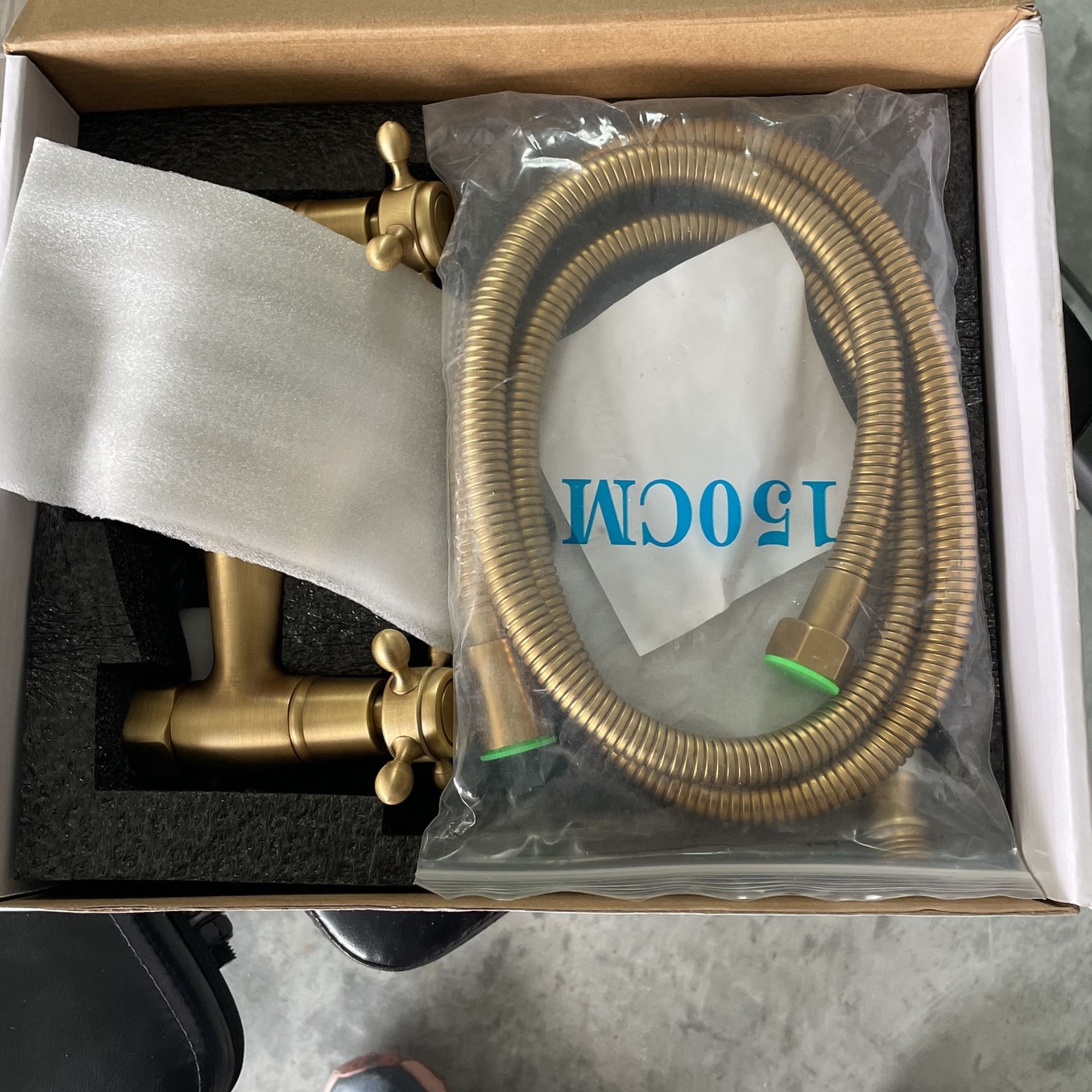 Faucet in Antique Gold, with shower hand held attachment for a free standing tub. Bought brand new and never used. Had adjustable mounting brackets for various spacing.