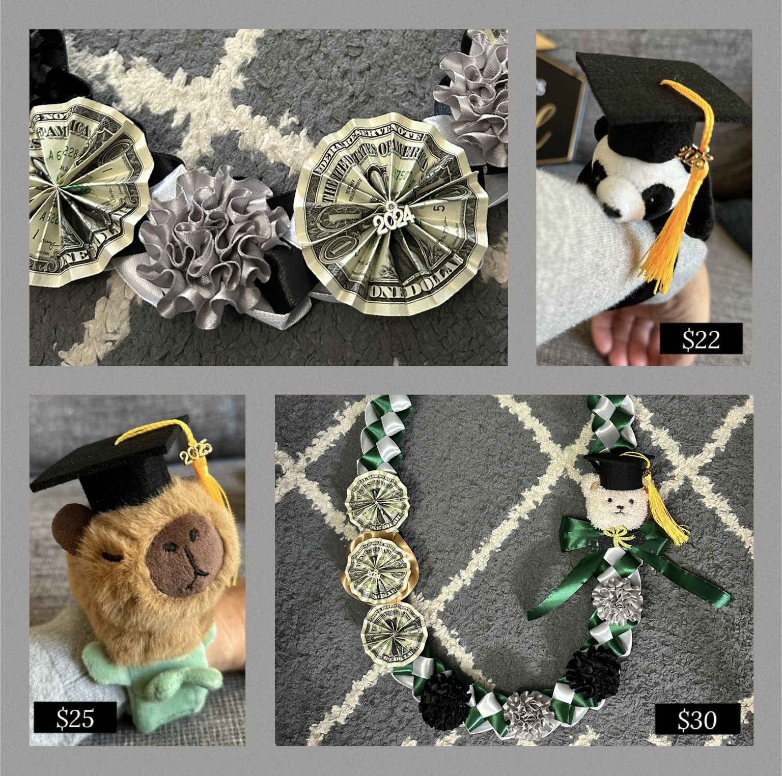 For Limited Time and Limited Quantities Only! Class of 2025 Graduation Leis Price starts from $15 DM me for the available colors Note: Please note that the colors or shapes of the plushies may vary slightly from the pictures shown, as they come as-is. Pickup at Poway/ Carmel Mountain/ Rancho Penasquitos Area Come from pet & smoke free home All sales are final Venmo or Cash only