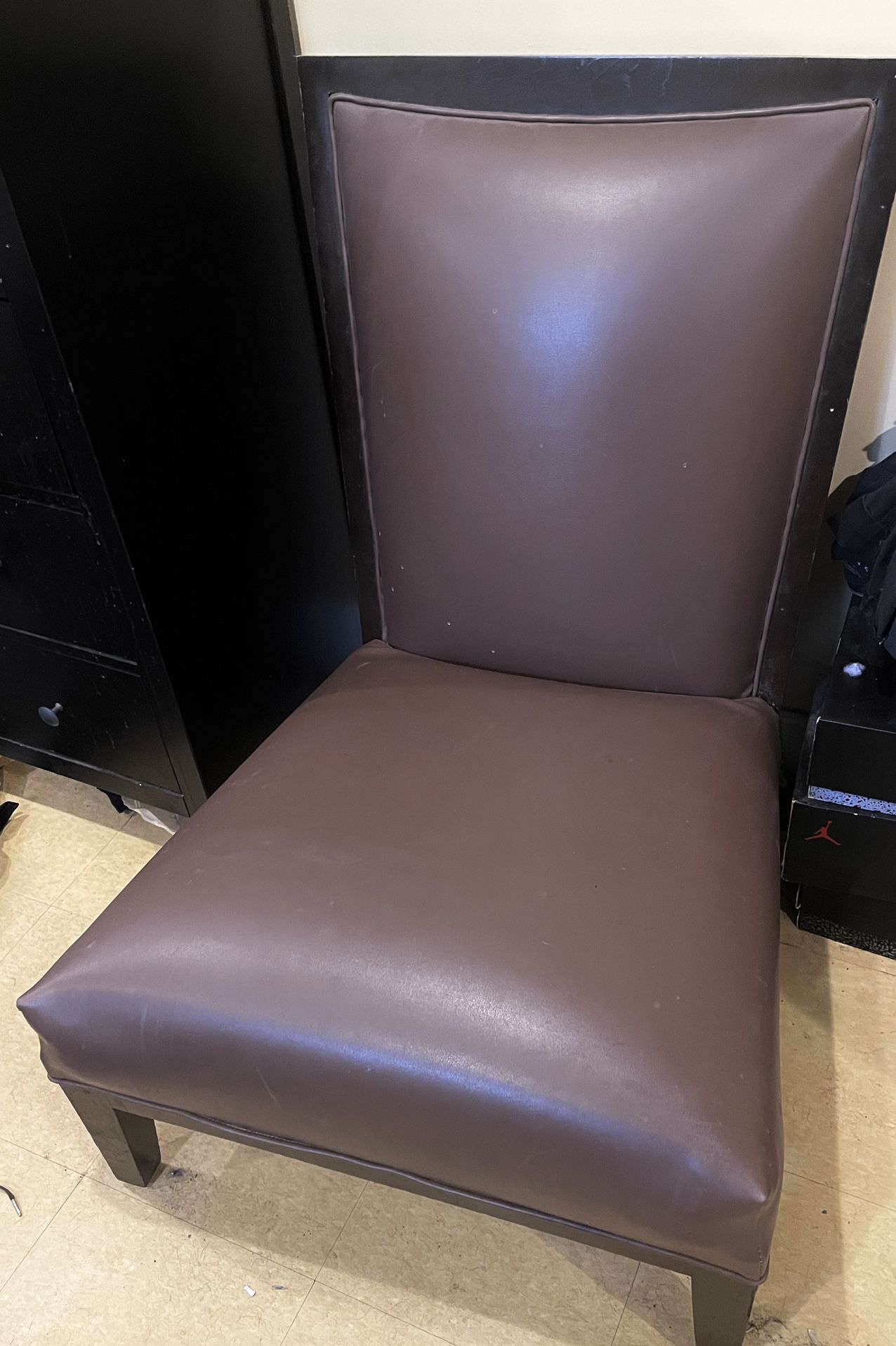 Set of 2 armless chairs Dark brown color Solid wood frame .it does have wear Heavy duty pleather like material They are dirty because they have just been sitting for while in storage No delivery See less