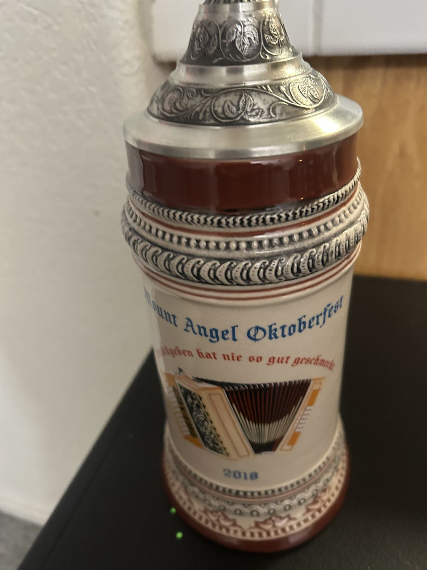 This is a Mount Angel Oktoberfest 2018 German beer stein with a pewter lid. It is made of ceramic or stoneware with a decorative pewter lid. The stein commemorates the Mount Angel Oktoberfest event from 2018 Beer steins are popular as collector's items and are produced in limited editions for events. 10.00