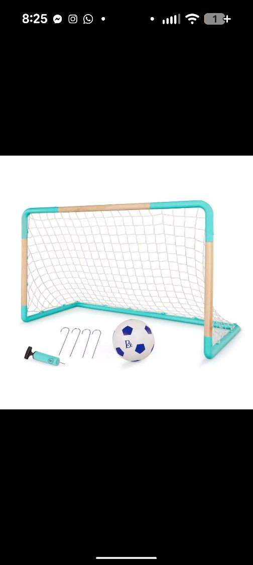 B. toys Kids Soccer Net & Ball set with a wooden frame.