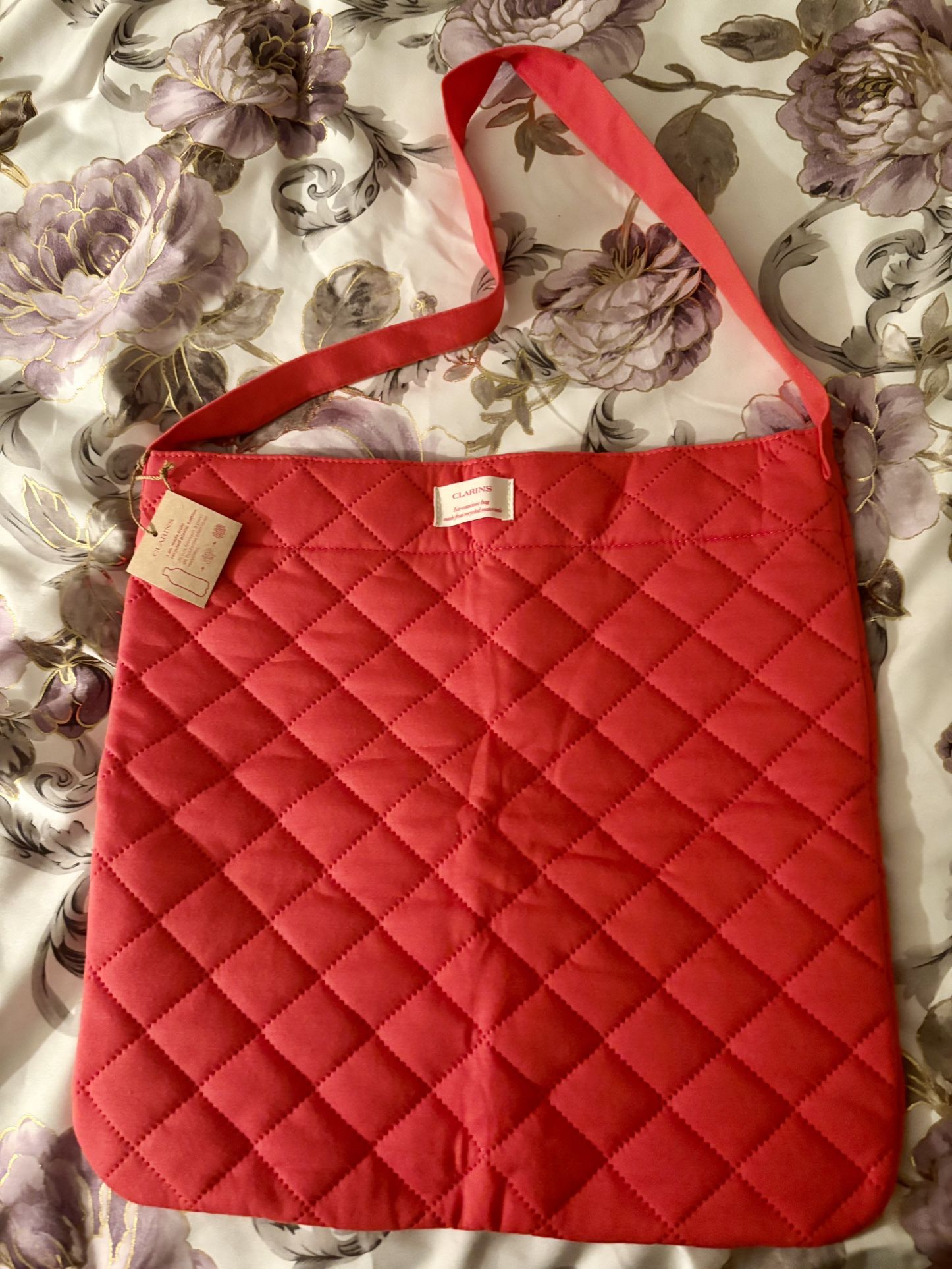 Clarins tote bag. New with tags. 15” X 15” 28” including handle. Beautiful fabric (recycled materials) and color dark melon. Comes from a smoke free environment.