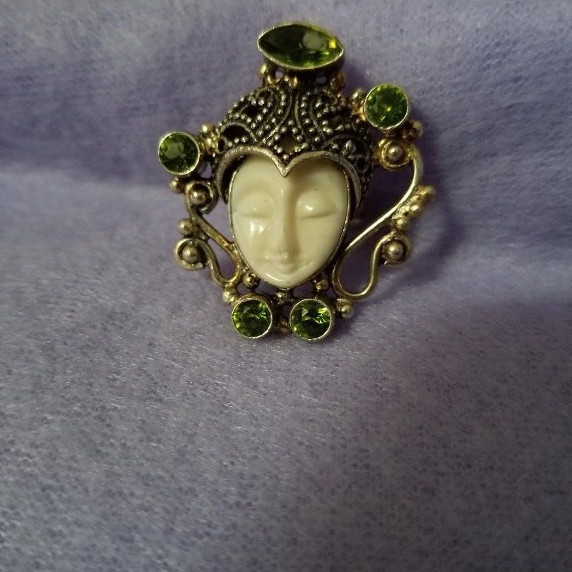 Carved Sajen Goddess Face Ring is unique and beautiful! Face is hand carved from bone. Chrome Diopside Stones accent ring. Setting is 925 silver and stamped. Ring measures 5/8" or 1.6 cm. Handcrafted in India. It shows a 6.5 on the ring size cone.