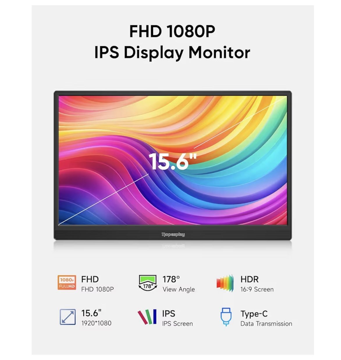 Brand new in the box Portable Monitor, 15.6" FHD 1080P Travel Portable Monitor for Laptops, Ultra-Slim External Portable Screen for Laptop with Kickstand, Screen Extender for Laptop PC Mac Phone PS4/5 Xbox Switch Screen Size 15.6 Inches Resolution FHD 1080p Aspect Ratio 16:9 Screen Surface Description Matte Image Contrast Ratio 1000:1 【Important Notice】For a single USB-C to USB-C connection, please note that your laptop's USB-C port must support video output (a full-function port). If you experience any issues, contact us for immediate setup guidance tailored to your specific model. 【15.6" FHD 1080P HDR IPS Display】The Dopesplay portable laptop monitor has a Full HD 1080P IPS display that delivers sharp visuals and vibrant colors. HDR support enhances your viewing experience, making colors pop and contrasts stand out. Whether you're working on designs, watching movies, or gaming, this monitor always delivers clear images and vibrant colors. 【Plug and Play Right Out of the Box】No complicated setup needed! This portable laptop monitor instantly connects as a second screen—plug it in and start using it. It works with most modern laptops via USB-C, so you’ll be ready to go in seconds. Note: Some laptops and phones without full-featured USB-C ports might need an extra USB-A to USB-C cable for power. 【Ultra-slim & Lightweight for Travel】Weighing just 1.4 lbs and only 0.3 inches thick, this portable monitor fits easily in your laptop bag, making it perfect for travel or commuting. It extends your laptop screen so you can work on multiple displays wherever you are. It’s a great choice for remote workers who need extra screen space without additional weight.