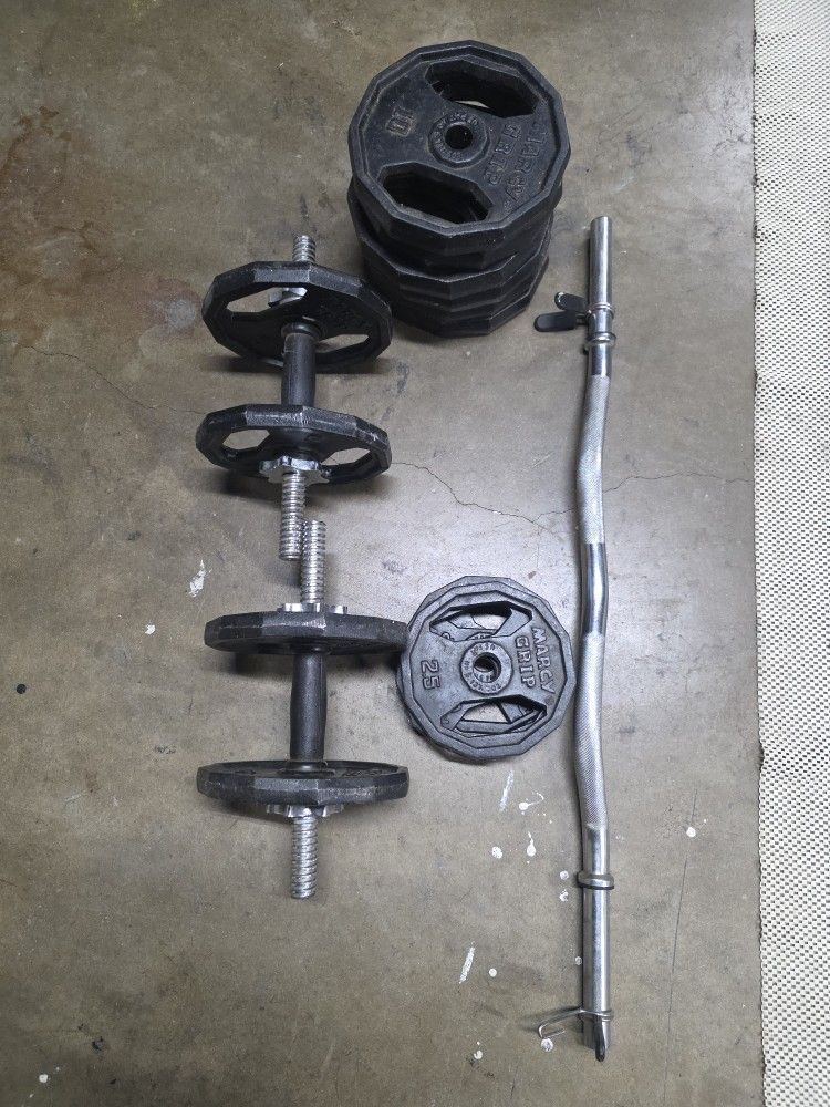 Curl Bar, Adjustable Dumbells, Weights.90 pounds. 10lb x 6. 2 1/2lb x 4. 5lb x 4