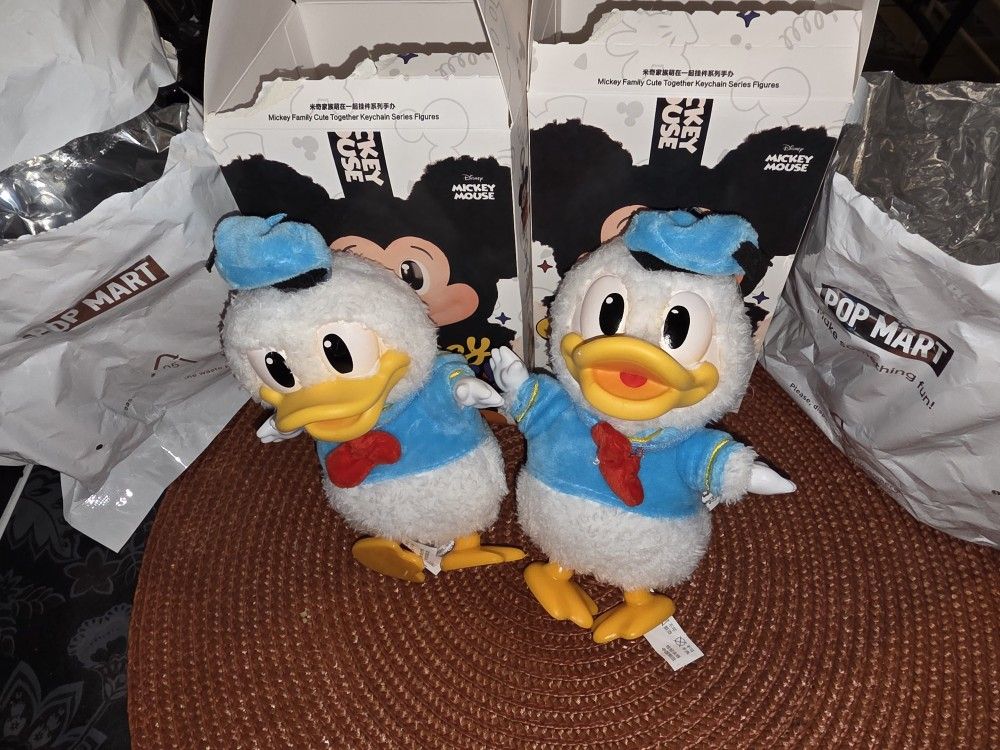 $15 each Pop Mart Disney Mickey Family Cute Together Series Plush Keychain. The product Donald Duck, Each figure is approximately 5.5 to 5.9 inches tall, not including the chain. The product is officially licensed by Disney.
