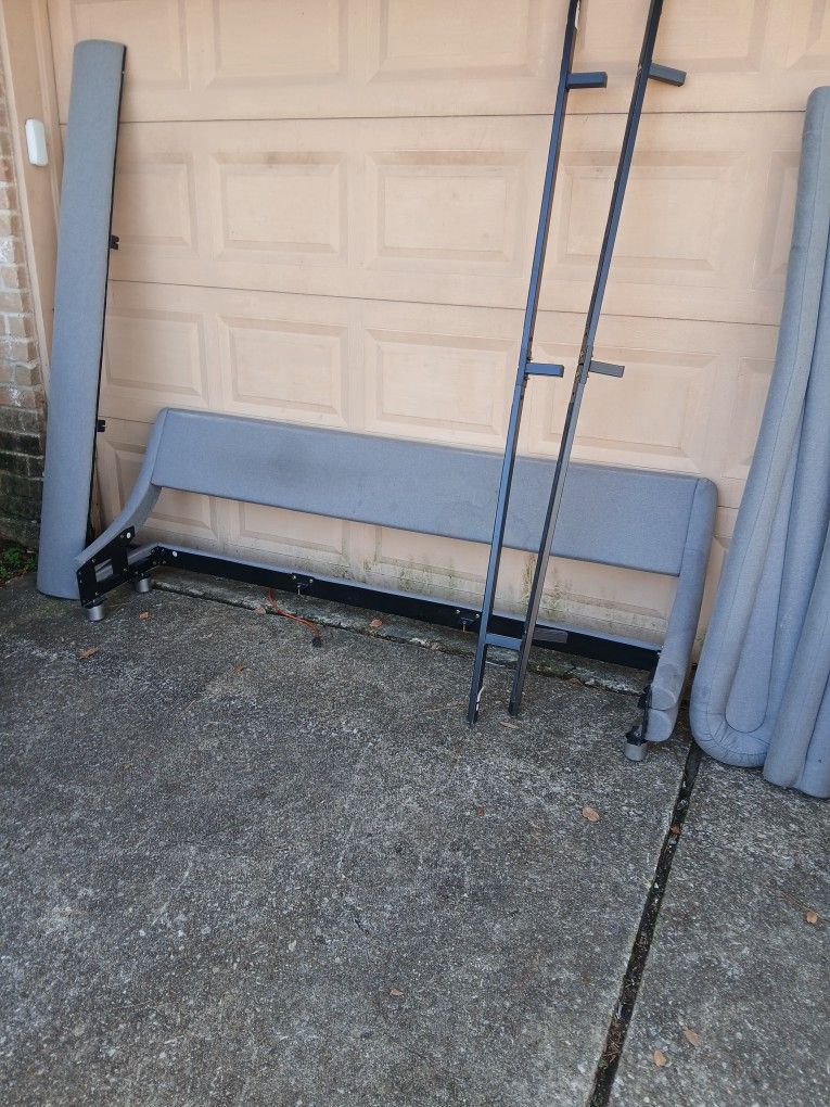 Queen size The sale includes the headboard, footboard, 2 side rails and 2 support pieces. It's sturdy The fabric needs cleaning in several places. I have some of the bolts but not all of them.