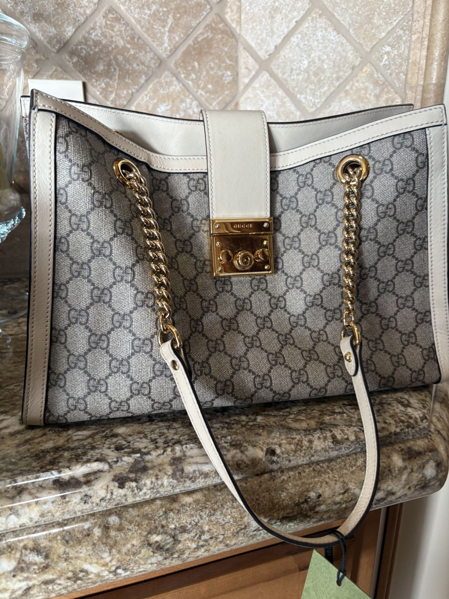 Selling an authentic Gucci Padlock Chain Tote in the classic GG Supreme coated canvas with leather trim and gold-tone chain straps. Medium size β stylish, durable, and perfect for everyday use. πΌ Condition: Gently used / great condition No major wear, cracks, or stains Clean interior Hardware still shiny with only minor hairline scratches π¦ Includes: Original Gucci box Receipt Dust bag π Size: Medium β comfortably fits a wallet, tablet, makeup bag, phone, and other daily essentials. Gorgeous, versatile, and 100% authentic. Open to reasonable offers β feel free to message me!