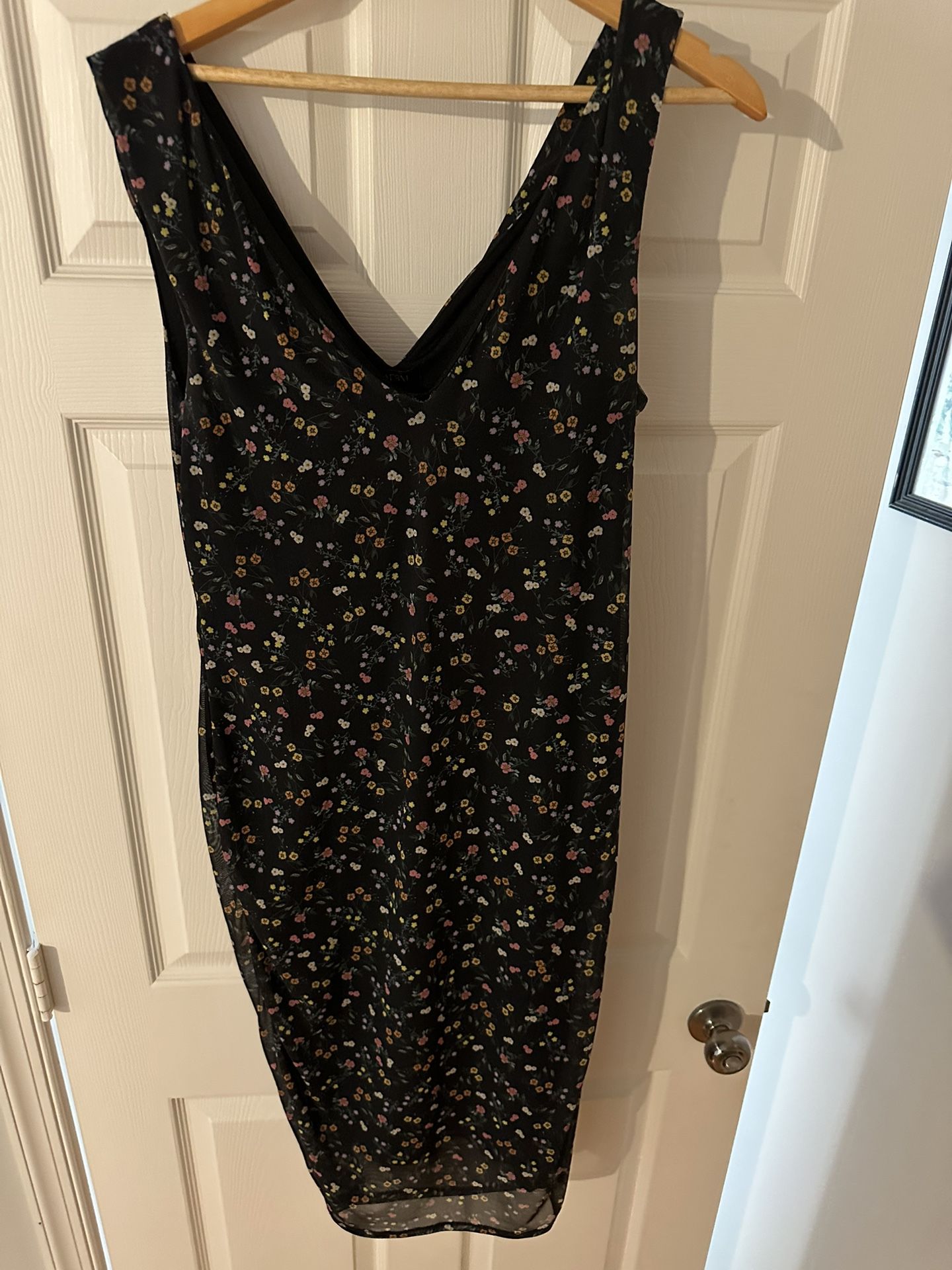 Beautiful AFRM midi dress featuring a black base with a delicate multicolor floral print. This dress has a deep V-neckline in both the front and back, creating an elegant and flattering silhouette. The fabric is soft, lightweight, and very stretchy, making it comfortable while still hugging in all the right places. Perfect for date nights, dinners, vacations, weddings, or dressed down with sandals or sneakers. Pull-on style with no zippers, easy to wear and easy to style. Brand: AFRM Size: XL / TG Color: Black with multicolor floral print Fit: Body-skimming with stretch Length: Midi Material: Soft, stretchy mesh overlay with lining Condition: Excellent pre-owned condition, no visible flaws Retail price: $128