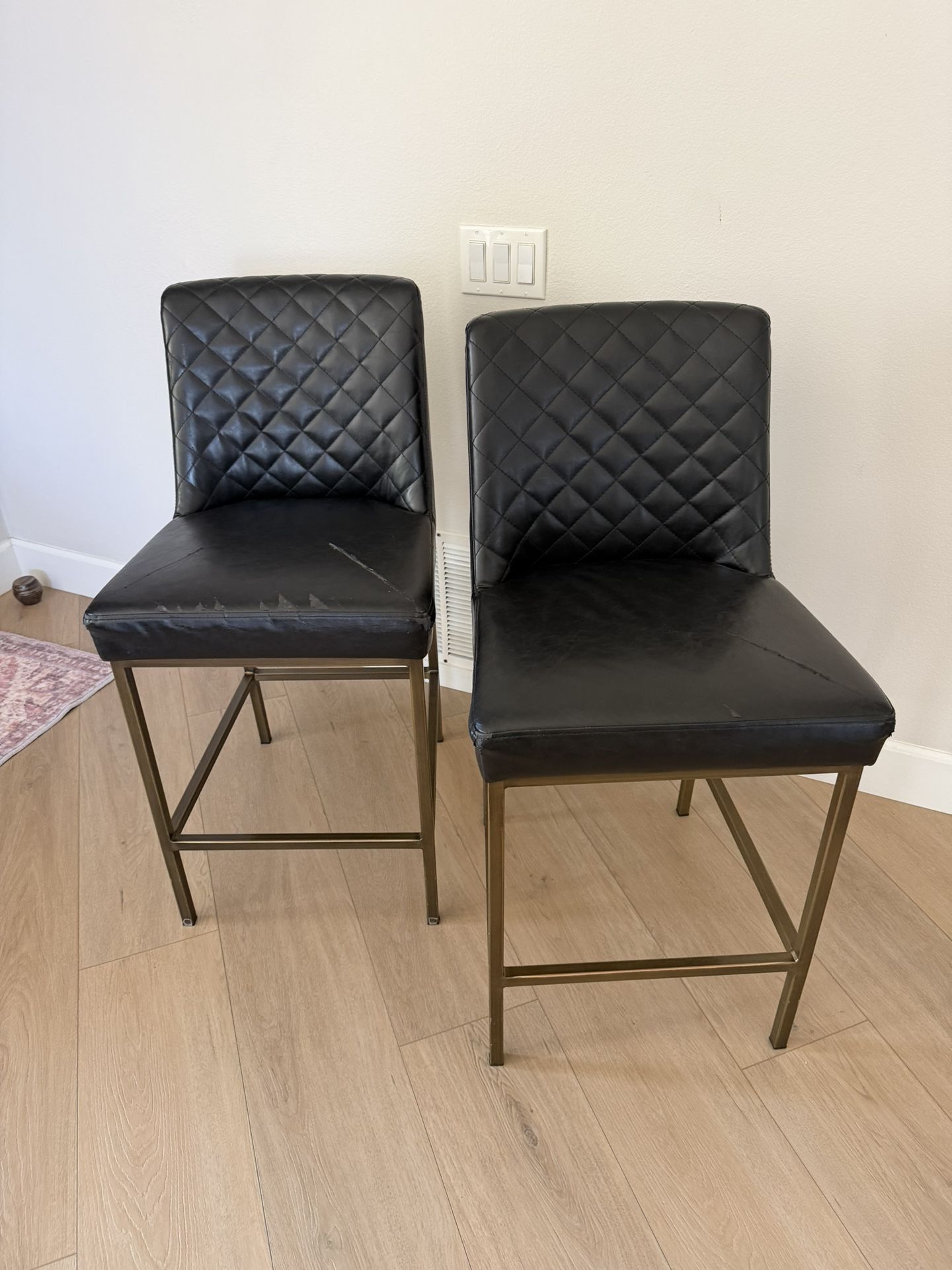 Used bar chairs. Frames are solid, but the synthetic ( vegan leather) seats have wear and tear and will require replacement. Priced accordingly. Height 25”