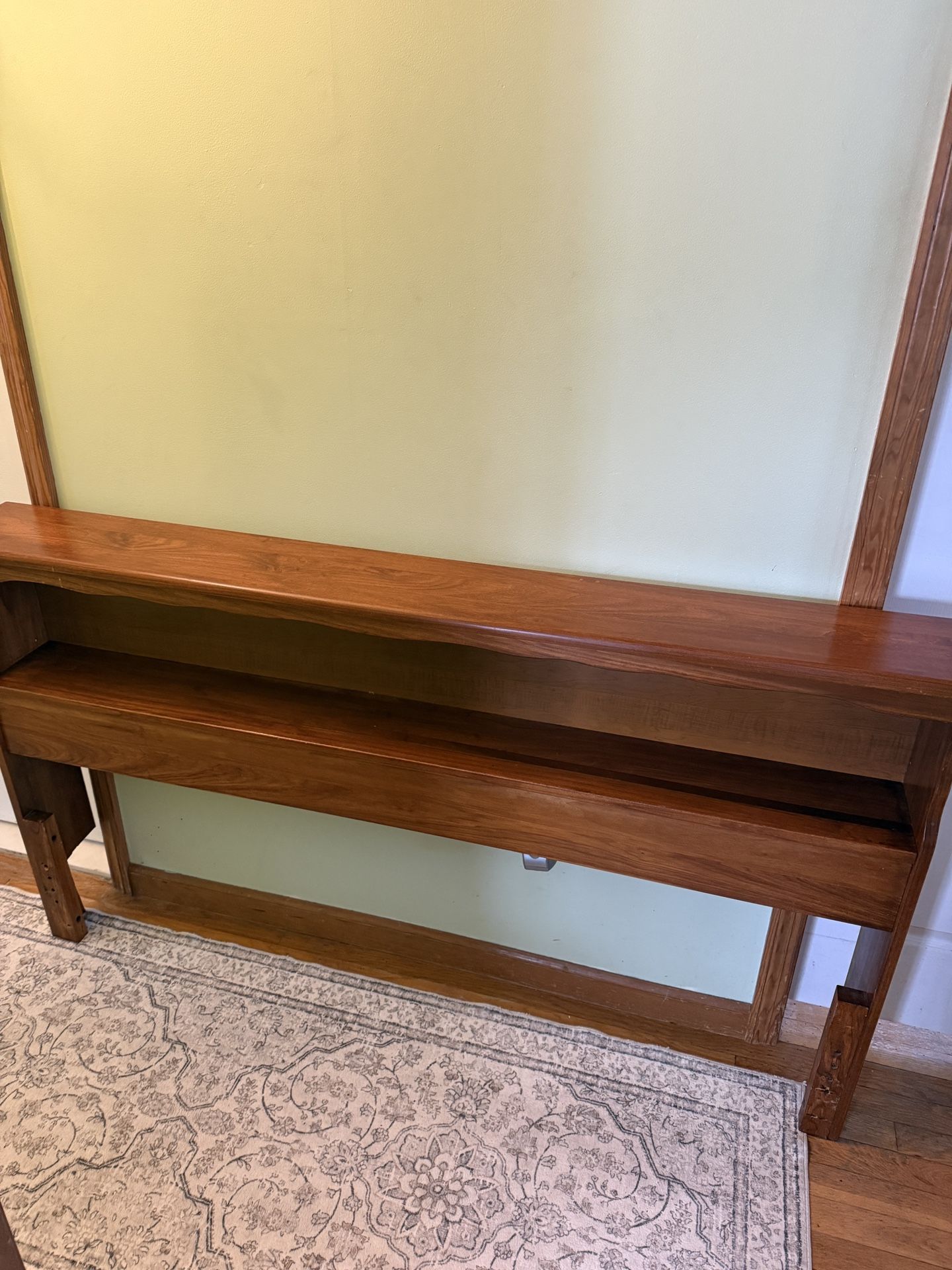 Solid wood queen headboard support legs notched out to clear radiator, so can fit snug to wall