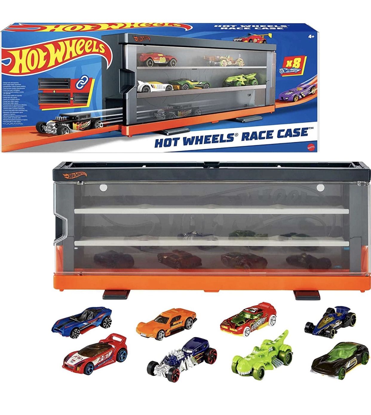 (NEW) Hot Wheels Race Case with 8 Toy Cars, Interactive Display & Storage for 12 1:64 Scale Vehicles, Connects to Track
