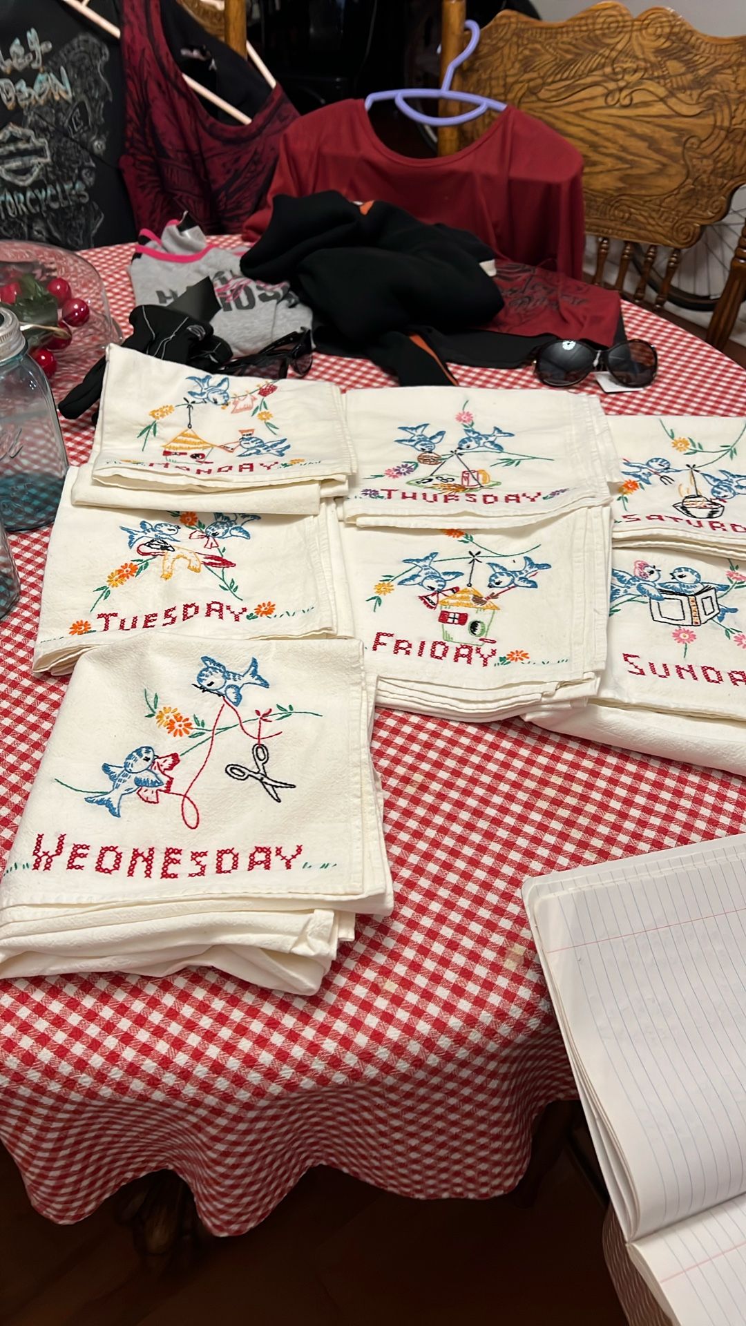 Complete Set Of Vintage Day Of The Week Dish Towels, Hand Embroidered