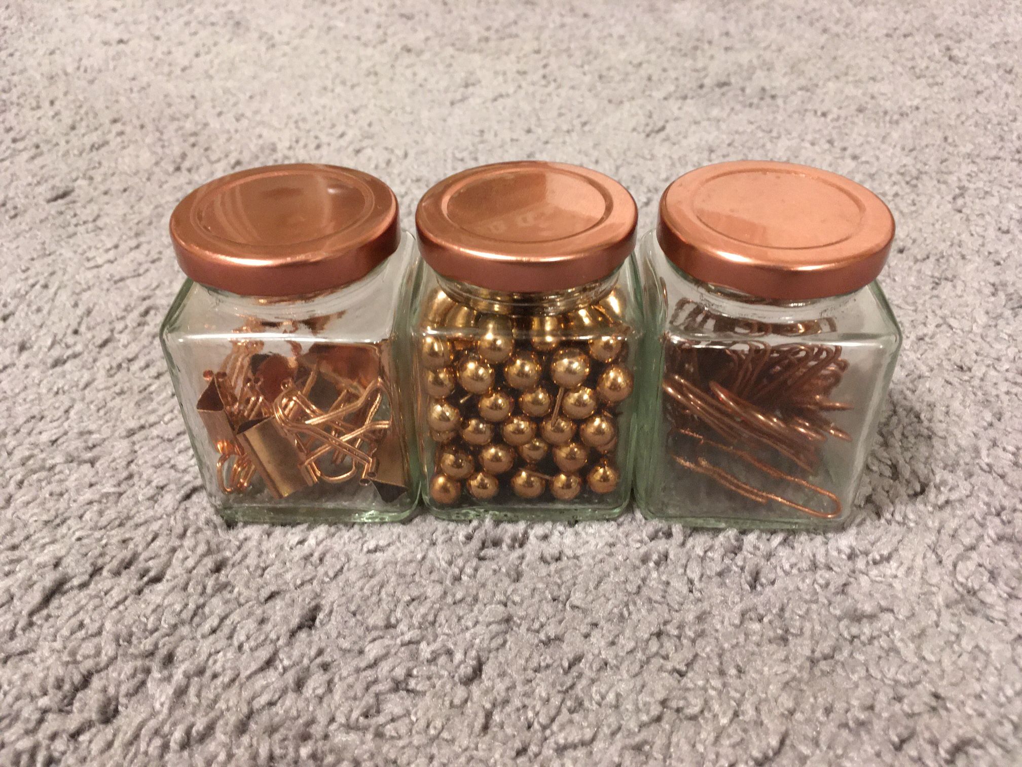 Trio of decorative rose gold colored jars with rose gold clamps, push pins, and paper clips in them. Great for fall autumn decor! Be sure to check out my other items!