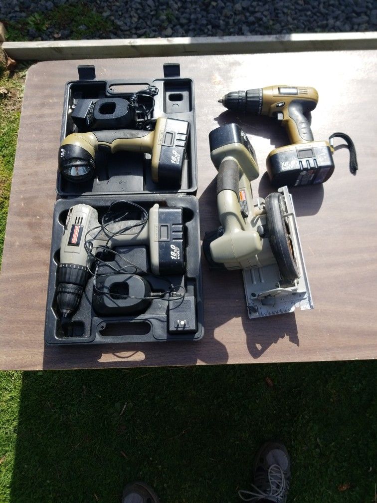 2 drills 1 flashlight 1 saw 4 old batteries 2 chargers (one is dead) 1 case