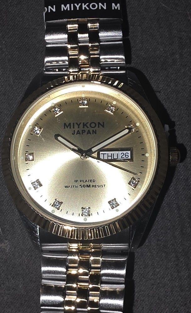 Miykon Men's Watch Brand NEW, Never worn x Japanese Quartz movement. IP Plated two-tone stainless steel. Gem hour markers $30 local pick up, public place.