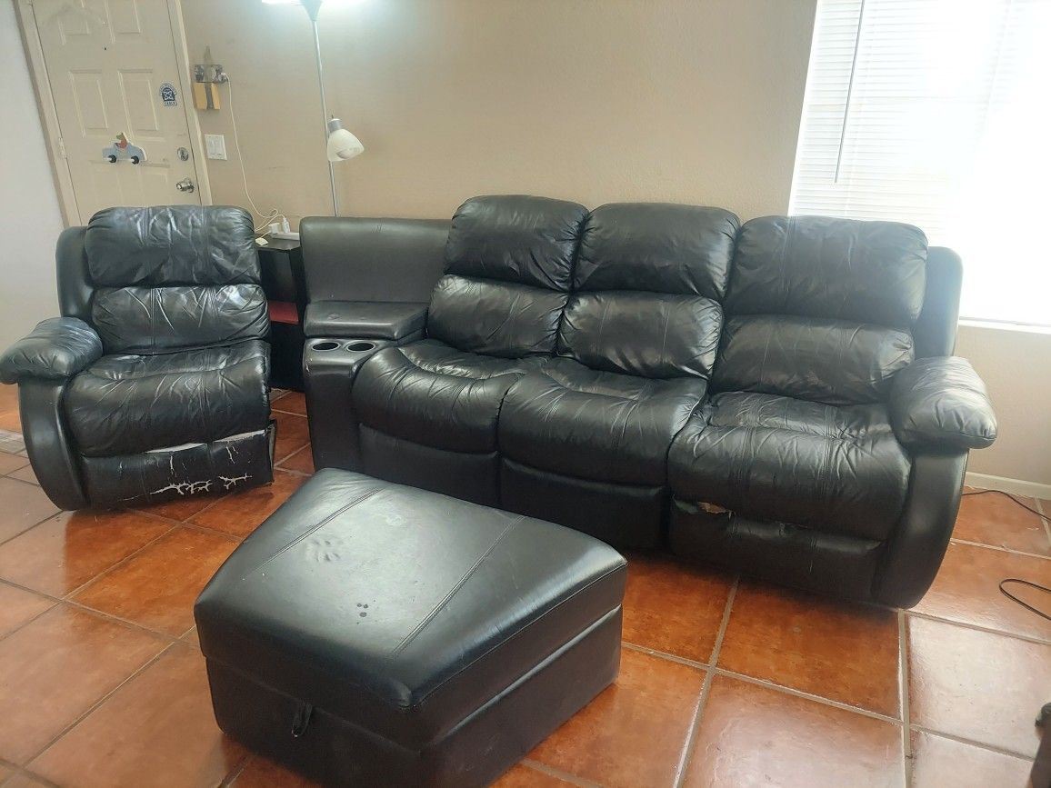 Moving sale, black leather couch need gone ASAP! Two end chairs recline. Love seat is removable and can detach from the middle console and reclining chair unit. Some tears on the bottom of the reclining chair / foot rest. Huge ottoman for storage included. For local pick up only. Smoke-free, pet-free home. Located in Legacy Legends condos, Green Valley Henderson. Asking $75, or name your price if you can come and move it out the next one or two days! Additional items for sale: Charcoal gray / black TV stand $35. Stand only, tv, games, printer and everything else not included.