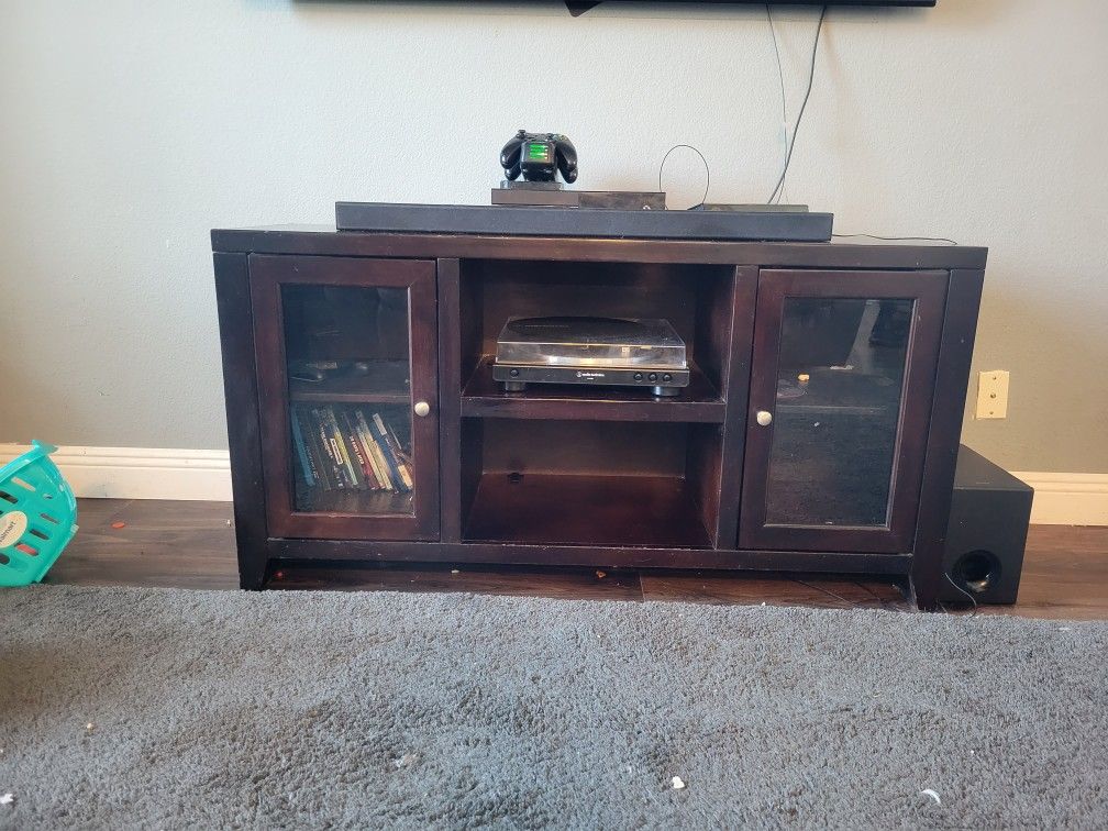 Dark wood tv stand. Very solid, few dings on it