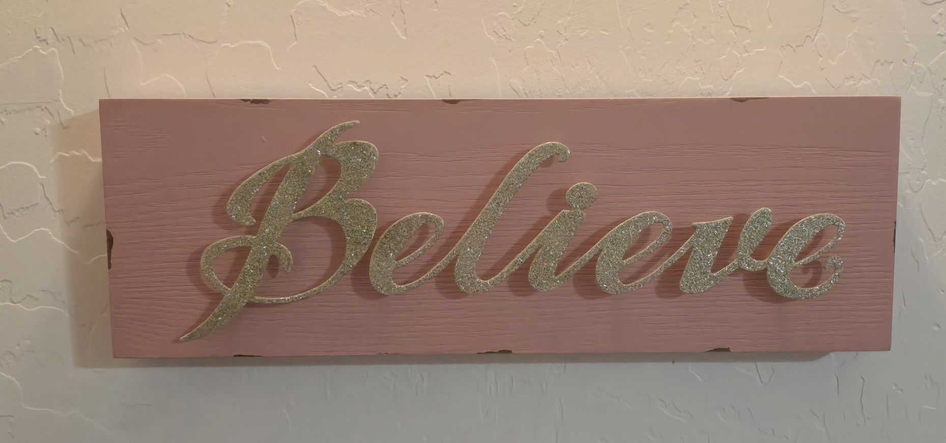 Pink wood sign "Believe" in gold glitter. Excellent condition Pick up:: Power/ Baseline or McClintock/ Chandler Blvd