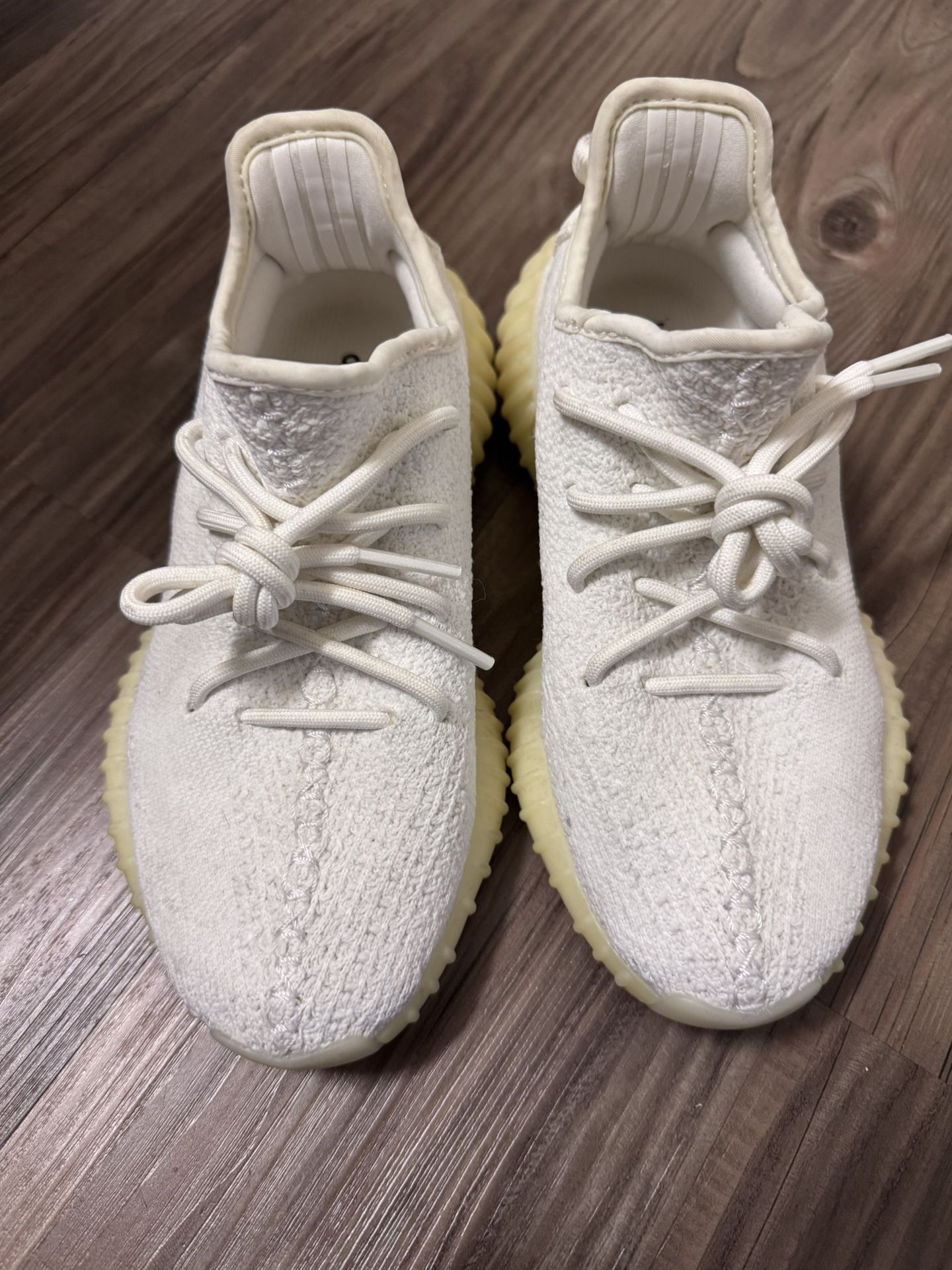 Used without box. Yellowing on soles and minor stains otherwise very good condition. No rips or tears. Size 4.5