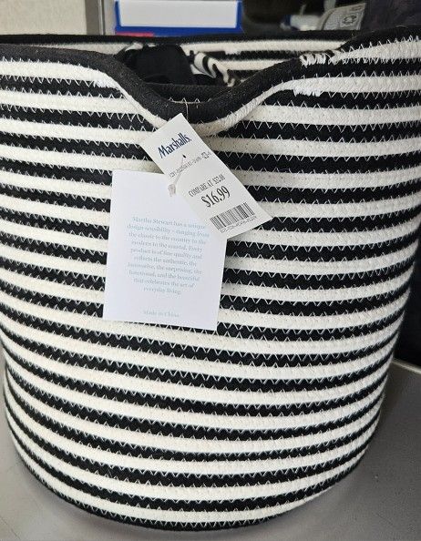 Mix of black and white striped and floral decor 2 velvet flocked candles and one small frame 4 small black accent mirrors 2 round striped accent mirrors Shoe holder Striped basket