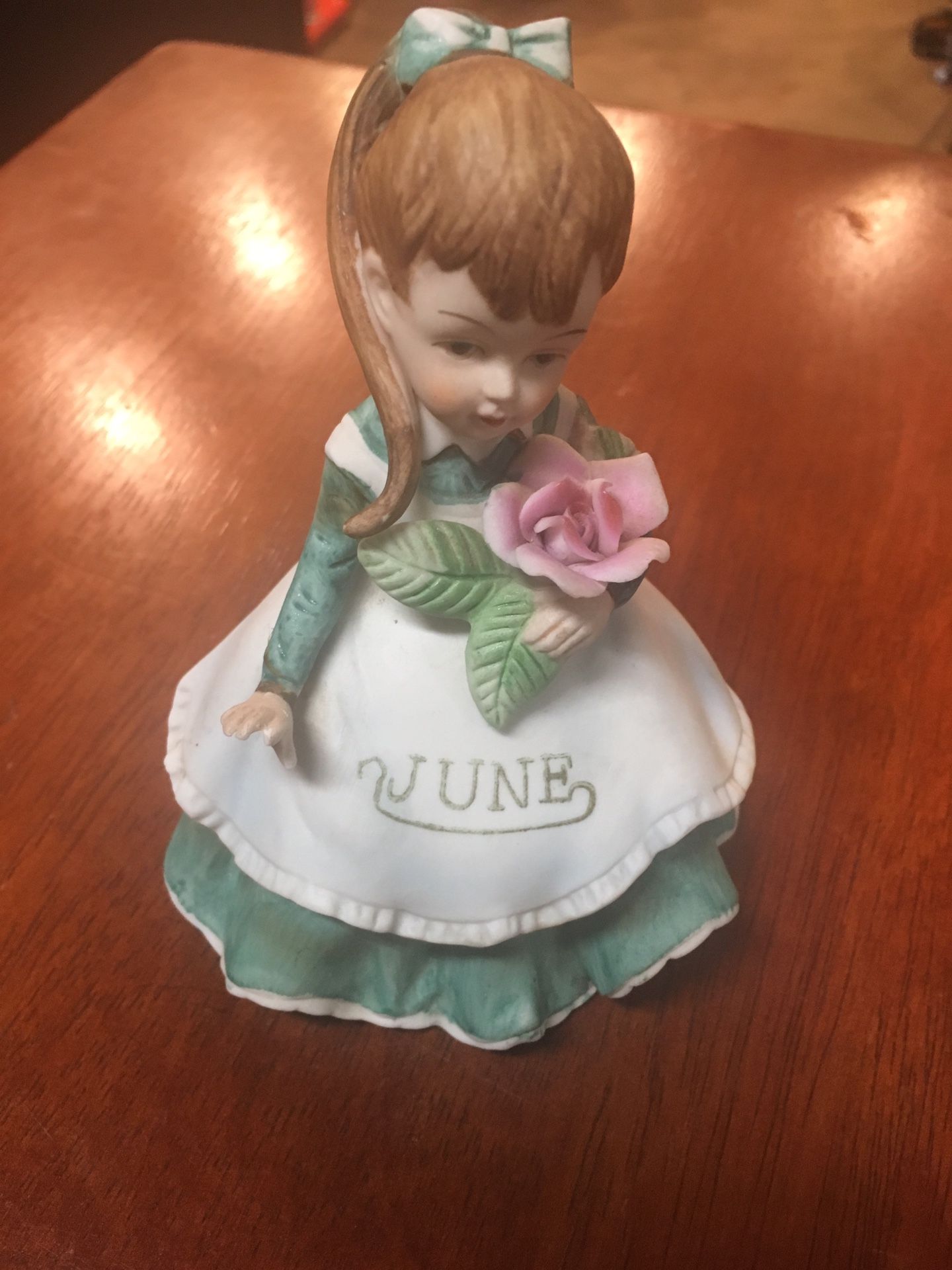 This little lady is holding a ceramic rose and has a June sash on. She has the original Lefton sticker on the bottom, and doesn’t appear to have any chips, cracks or damage to her!