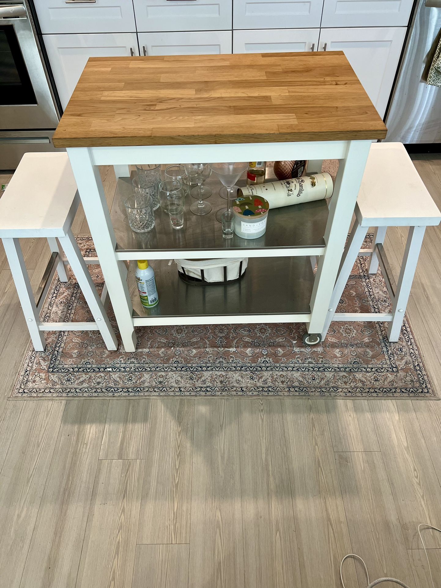 White kitchen island cart (with one set of wheels for easy moving) in very, very good condition! Two stools with footrests included. LxWxH Island cart: 31x20x35.25 Stools: 9x17x24 Minor scratches on the cart's legs and small stain on one stool (pictured) that could all be easily covered with a paint marker. Rug and items on shelves not included