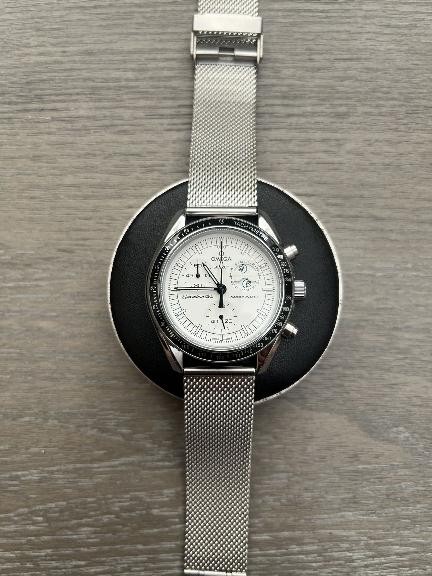 Enjoy a unique, custom-built MoonSwatch metal case mod with better looks and durability. This watch features: - Stainless steel case for premium durability (vs. original cheap plastic case) - Sapphire crystal for enhanced scratch resistance - PE50 Quartz Chronograph Movement for a smooth chronograph sweep (no more ticking!) - Slimmer profile: 11.5mm (vs. 14mm) - Increased Waterproofing: rated to 3 ATM (Safe for splashes and showers) This is made using the highest quality rep dial parts that I can find, and then I build them up onto a slimmer movement and place that all into the stainless steel case. I offer a variety of strap types and colors (leather, rubber, metal, NATO/canvas, etc.). Feel free to check out my page for additional strap options!